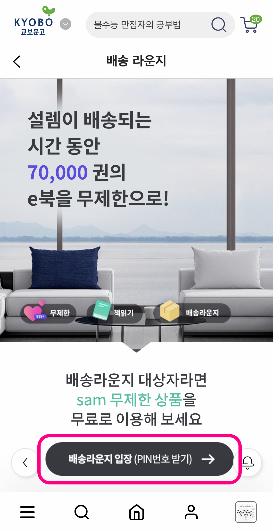 문제는 원하는 책과 이 최소 조건을 만족시키려다보니 결과적으로 배송일이 2일 이상이 되곤 합니다. 하필 두 권 중 하나가 바로 준비되지 않는 책이기 때문이죠. 그런데 약 이틀 간의 기다림을 채워주는 서비스가 교보문고에 있습니다. 바로 "배송 라운지"입니다.