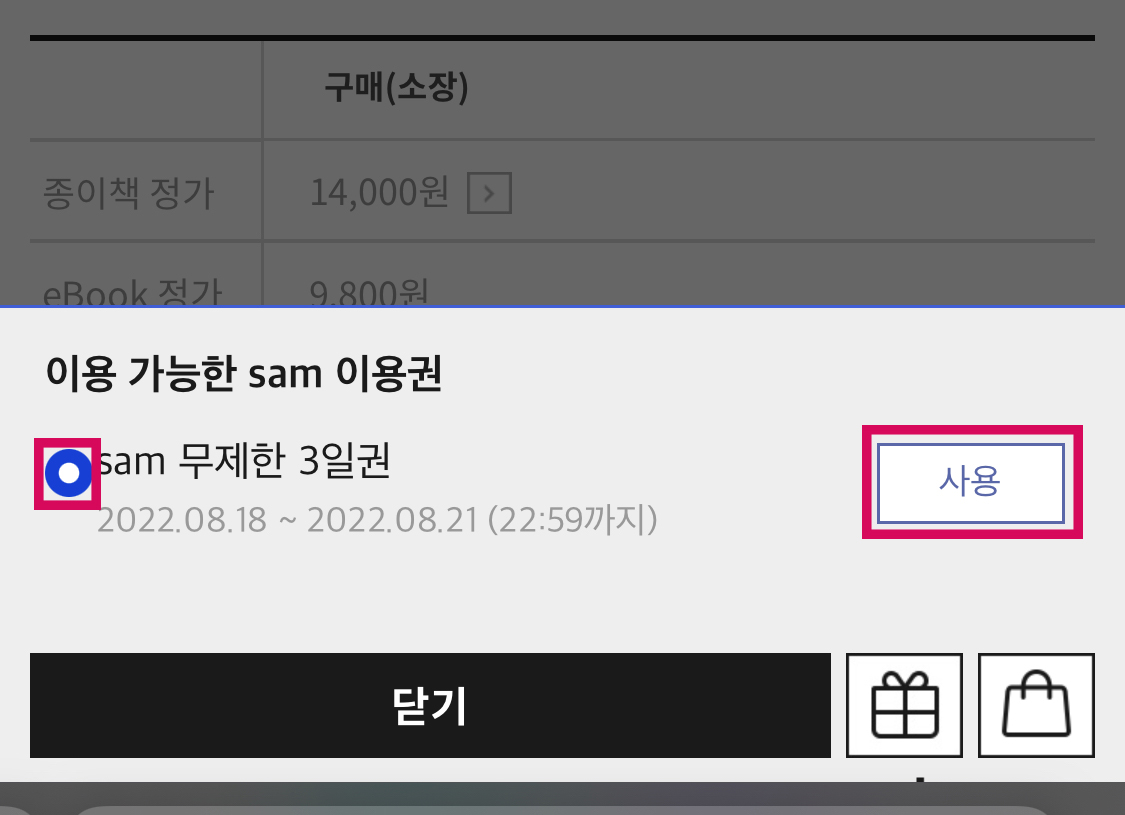 참고로 sam무제한이나 sam베이직 등 교보문고 전자책 서비스는 교보eBook 어플로 이용할 수 있습니다.