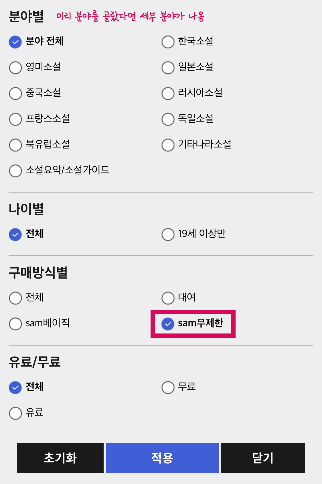 우리는 sam무제한이 표시된 책을 이용할 수 있습니다. 참고로 베이직이 무제한보다 리스팅 된 책이 많다고 하지만, 많은 경우 두 가지 모두 표시되어 있습니다. 그래도 헷갈리기 때문에 필터를 적용하는 게 좋습니다. 필터는 우측 상단 회색 영역의 버튼을 누르시면 됩니다.