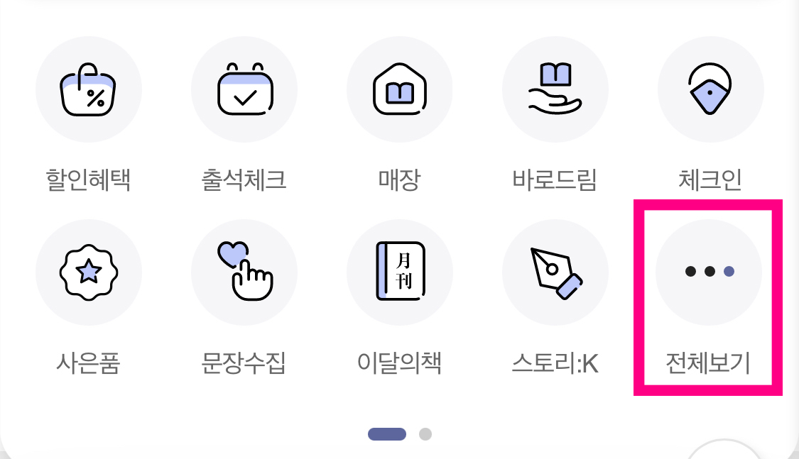 만약 실수로 닫기를 누르셨다면 당황하지 말고 교보문고 어플 메인(첫 화면)으로 가시면 됩니다. 메인에서 여러 버튼 중에 "전체보기"를 눌러주시고요.
