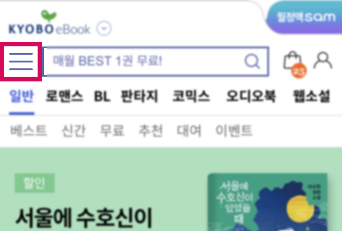 먼저 교보문고 eBook페이지로 들어갑니다. 검색창 왼쪽에 세 줄 아이콘이 있습니다. 그걸 선택해줍니다.