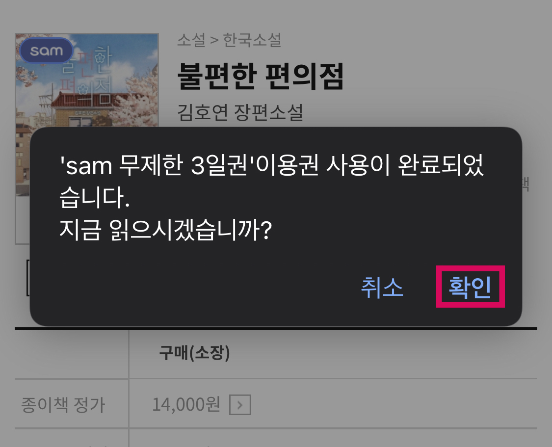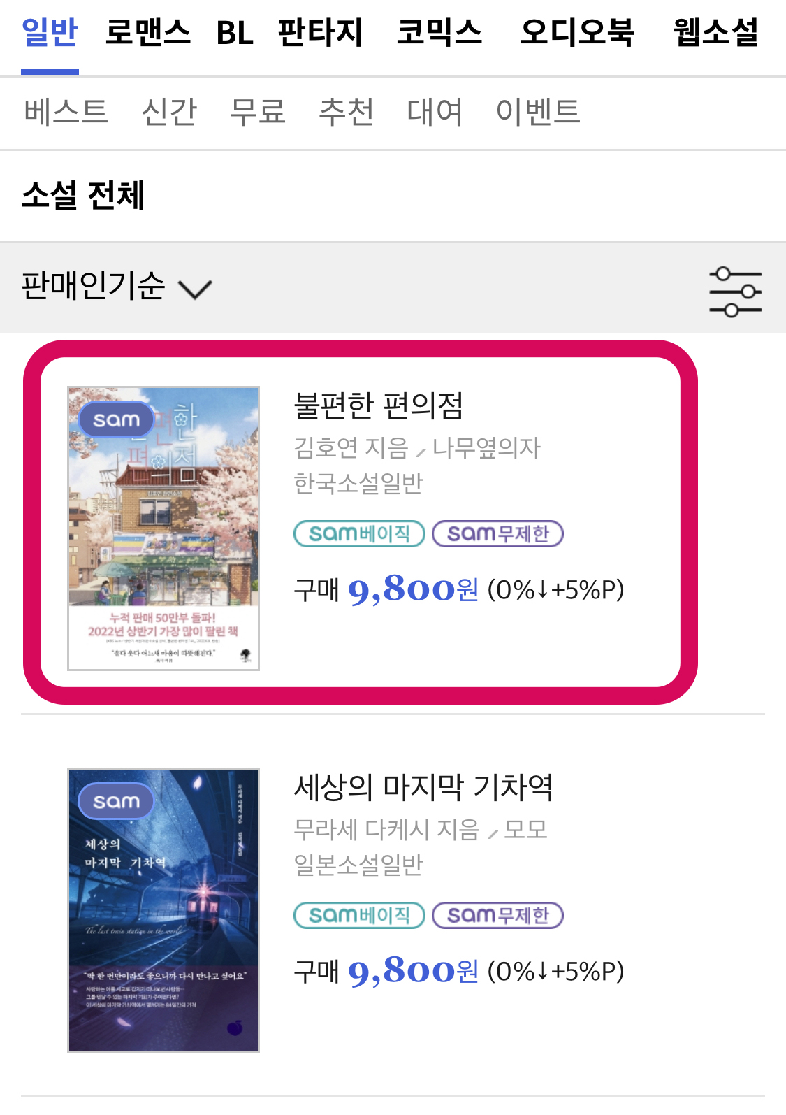 필터에서 sam무제한을 적용하셨다면 아래 리스트는 모두 sam무제한인 책들이 진열됩니다. 말씀드렸듯이 베이직이 무제한보다 많기 때문에, 무제한으로 쓰여 있는 책은 자연스럽게 베이직도 포함되어 있습니다. 저는 예시를 위해 맨 처음에 나온 "불편한 편의점"을 받겠습니다.