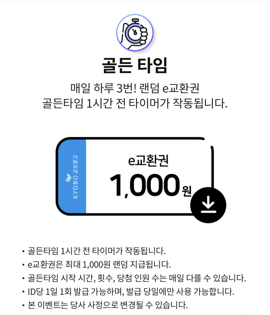 매달 출석체크를 해서 e교환권 2,000원을 모으고요. 이벤트, 오늘의 미션과 골든 타임으로 약 2,500~3,500원 정도를 받습니다. 대략 5,000원을 모으게 되죠. 물론 이벤트를 놓치거나 무작위 e교환권으로 더 적게 모으기도 합니다. 이렇게 모은 5,000원으로 무료배송 조건인 국내서적 1권 포함 1만원 이상 구매를 맞춥니다.