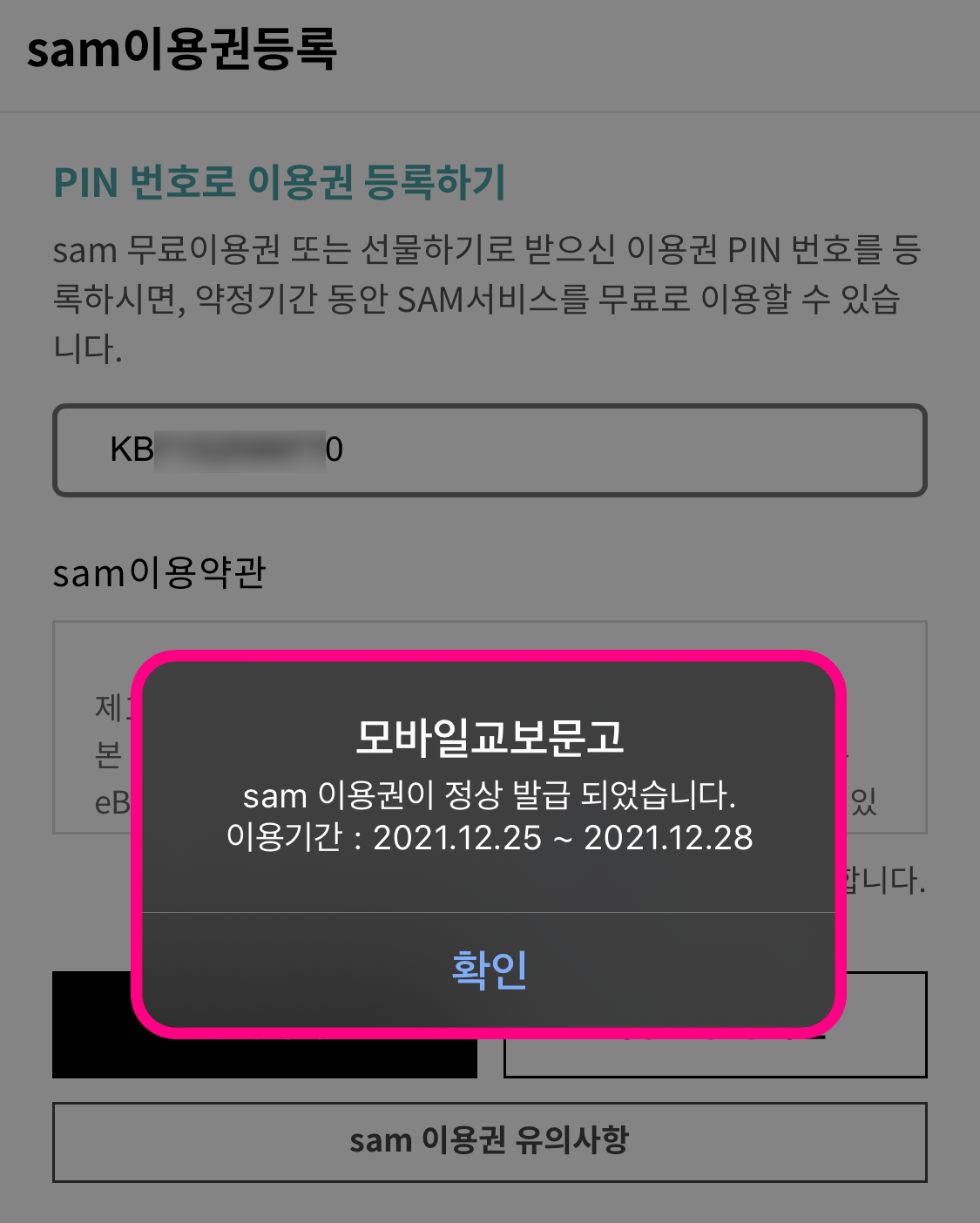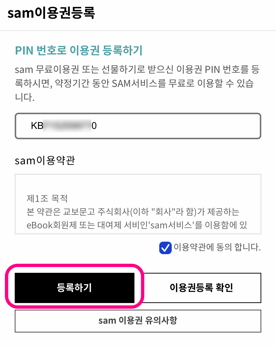 복사한 핀번호를 등록합니다. sam이용약관에 동의하신 뒤에 등록하기 버튼을 누르시면 모든 절차가 완료됩니다.