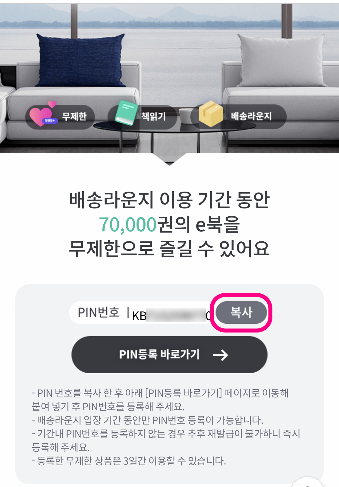 배송라운지 입장을 위해서는 PIN번호가 필요합니다. '응? PIN번호 같은 거 안 받았는데?'라는 생각이 드셔도 직관적으로 요 버튼을 누르면 된다고 느끼실 겁니다.