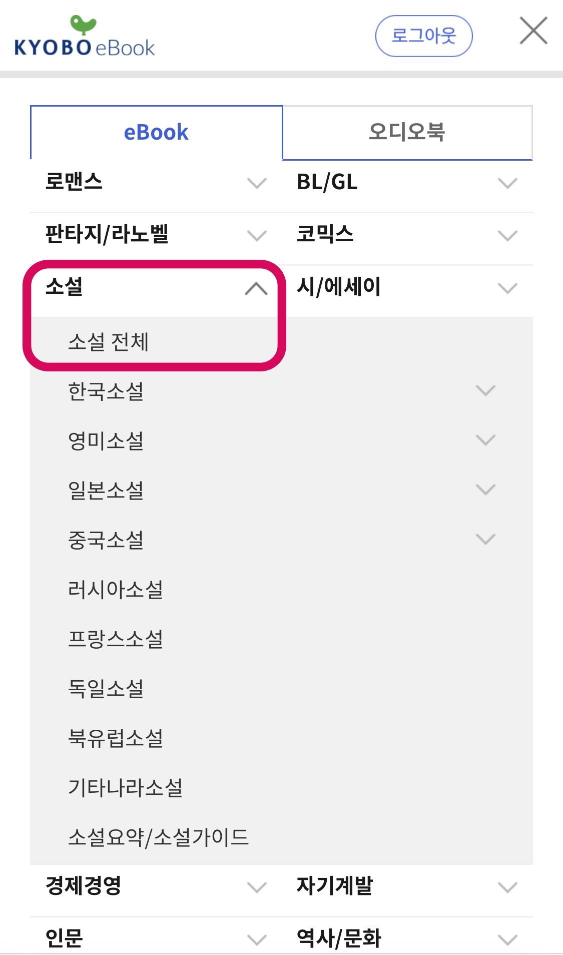 세 줄 버튼을 누르면 카테고리가 나옵니다. 큰 카테고리들과 세부 카테고리들이 있습니다. 저는 보통 세부 카테고리보다는 큰 카테고리에서 원하는 책을 찾습니다.