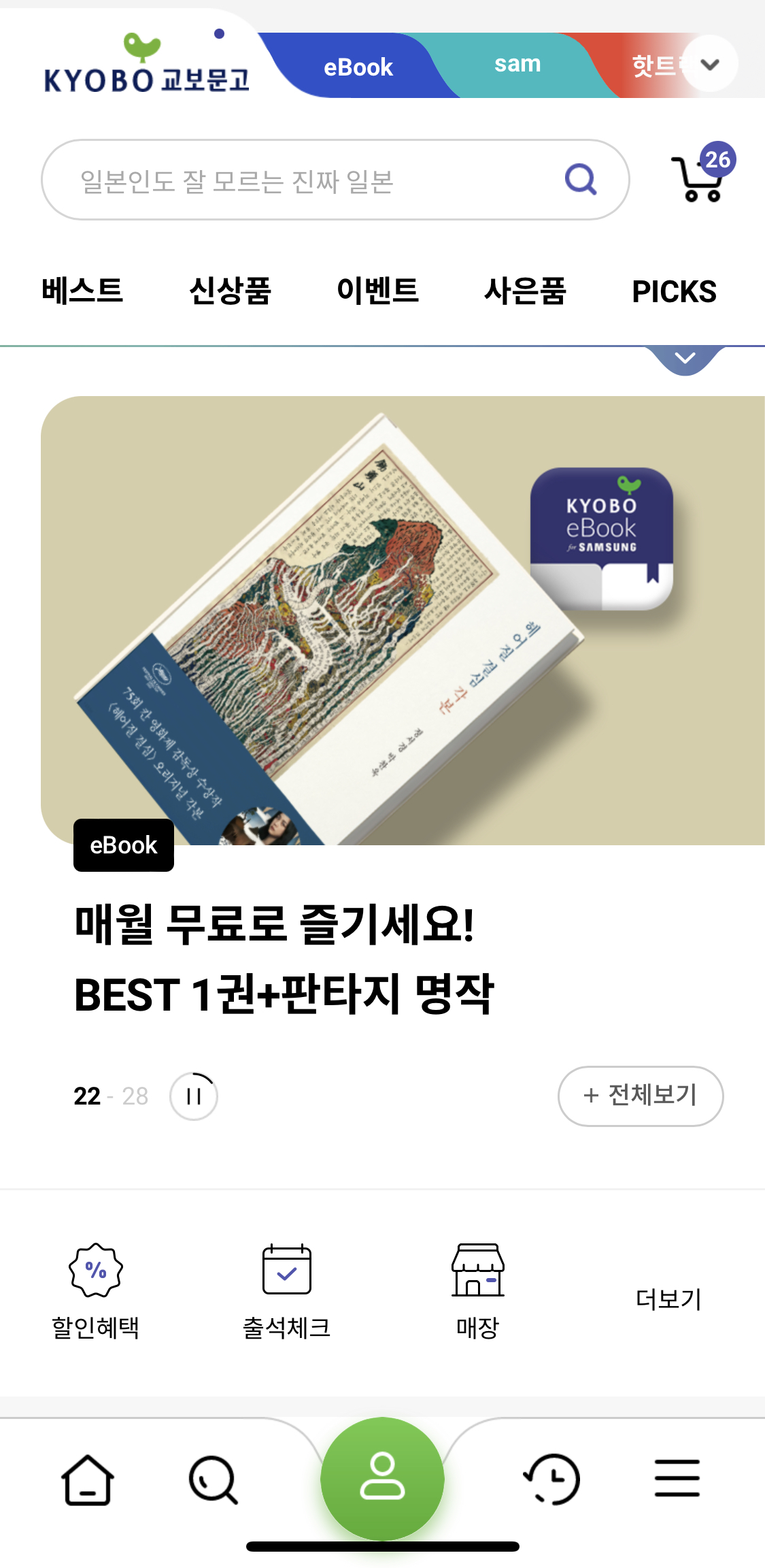 리뉴얼 이후 교보문고 eBook이나 sam을 찾기가 쉬워졌습니다. 예전에는 pc버전으로 나타났는데요. 글씨가 너무 작아서 클릭이 힘들었습니다. 모바일 용으로 따로 제작된 것과 상단에 하위페이지를 정리한 건 좋은 선택이 되었습니다.