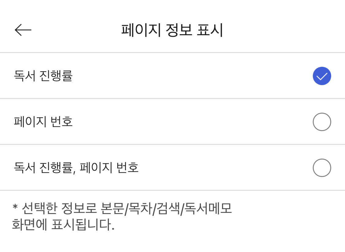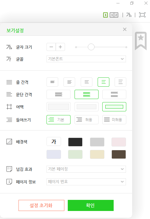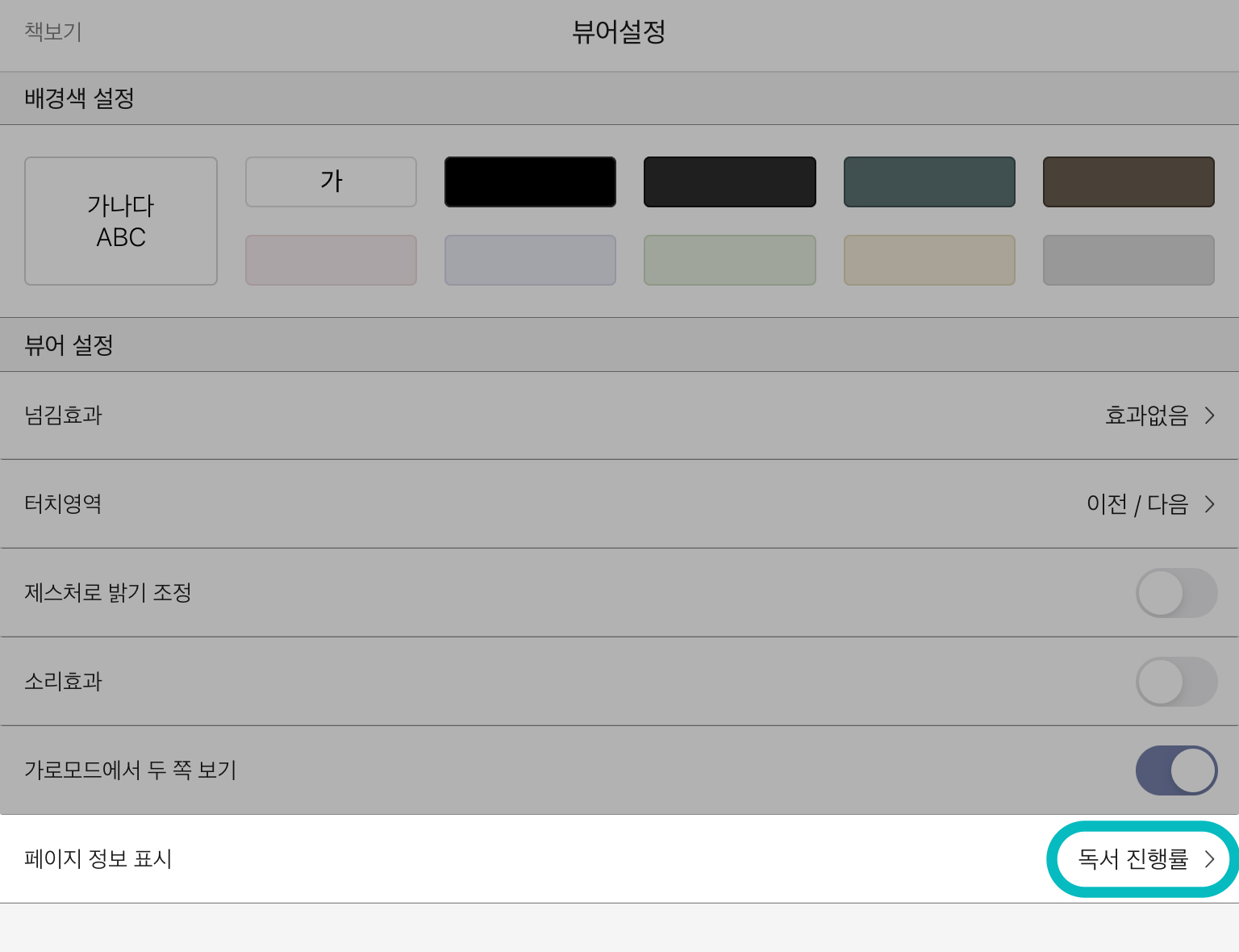 가장 오른쪽에 있는 뷰어 설정에서는 페이지 자체에 대한 내용을 다룹니다. 넘김 효과나 터치영역도 자유롭게 만지시는데요. 저는 반드시 맨 하단의 "페이지 정보 표시"를 "독서 진행률"로만 설정합니다. 제가 은근히 얼마나 읽었는지를 체크하는데요. 이런 습관 때문에 집중을 잃을 때가 종종 있었습니다. 그래서 가장 심플하게 계산도 하기 힘든 진행률로 설정했지요. 페이지 번호로 하면 '아! 조금 남았다!'라거나 '아직도 여기야?'라는 마음이 듭니다.