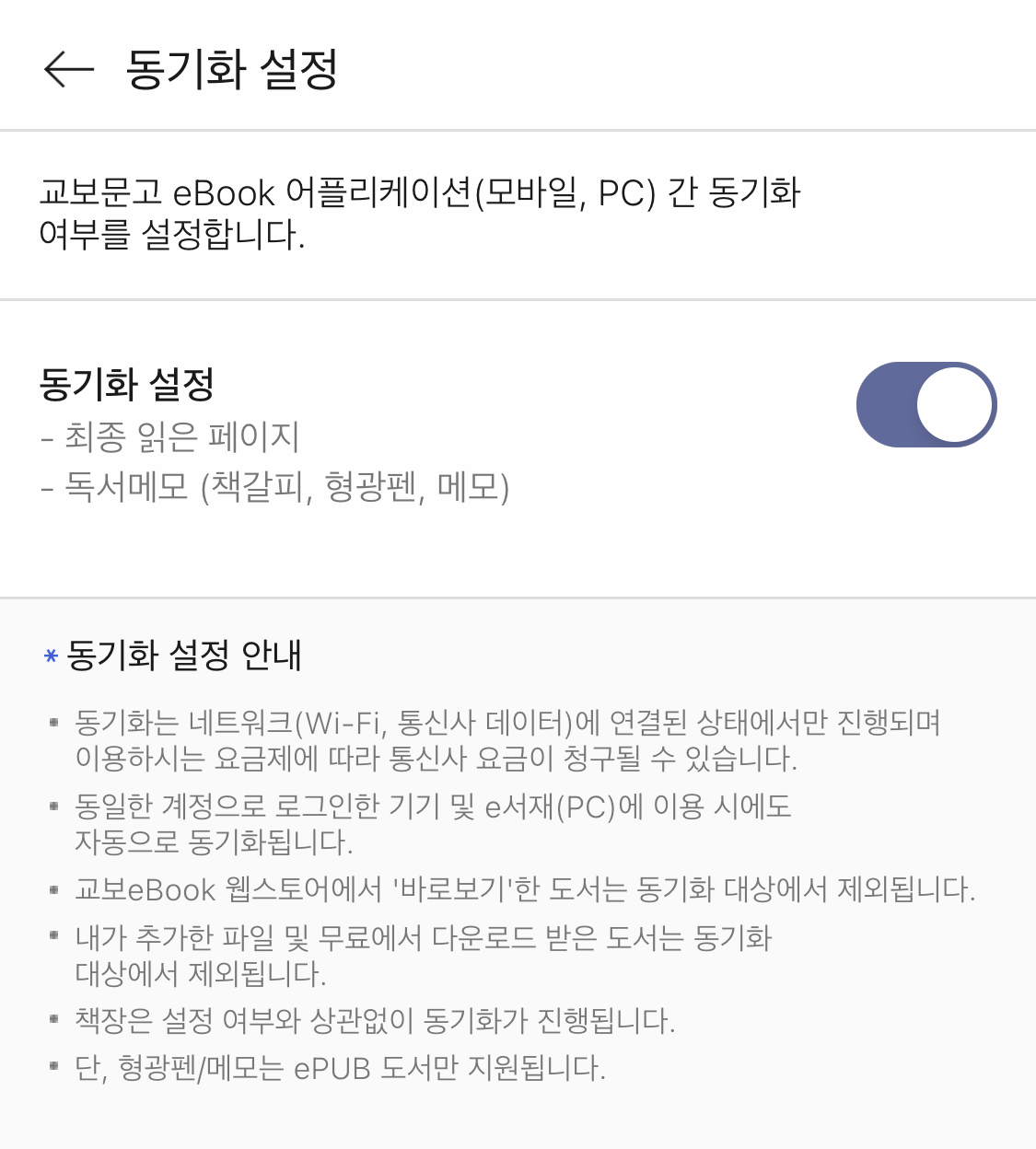 설정 영역에서 저는 세 가지만 아주 가끔 보곤 합니다. 교보문고 전자책은 한 계정당 최대 5대 기기까지 등록가능한데요. 여기서 기기는 PC를 제외한 스마트기기를 말합니다. 컴퓨터로 보는 pc뷰어는 별도로 분류되는 것 같습니다. 그래서 아이패드, 아이폰 요렇게 보통 두 개를 해둡니다.