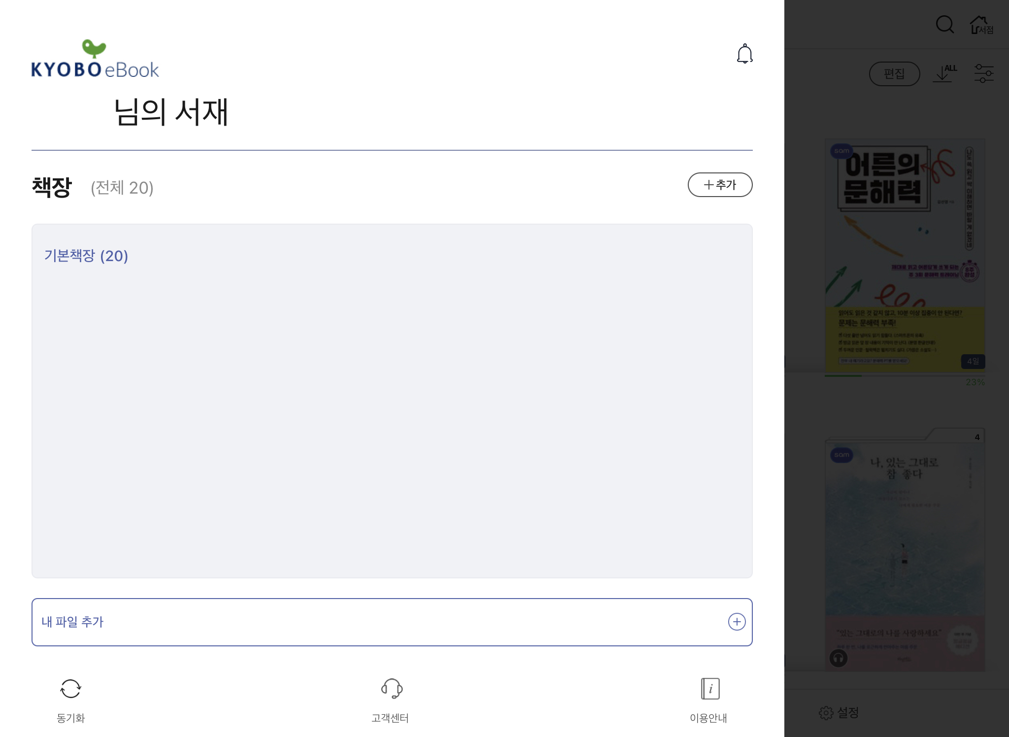 기본책장 왼쪽의 세 줄 버튼을 누르면 추가 서재를 만들어서 책을 분류할 수 있습니다.