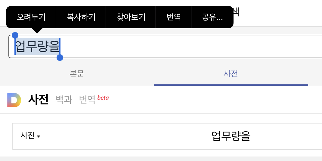 먼저 검색을 누르면 해당 구절에 대한 다음 사전의 결과가 나옵니다. 여기서 그 구절을 선택하면 복사를 할 수 있죠. 복사를 한 구절을 정리해서 서평을 작성하거나 인용을 할 수 있습니다.