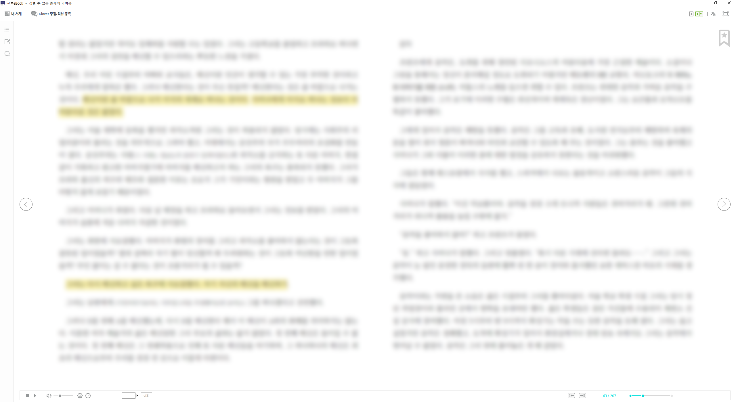 화면 왼쪽에 있는 아이콘들은 각각 목차와 독서메모입니다. 이것도 어플과 동일한 기능이지요.