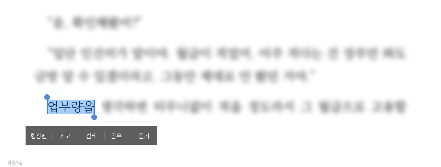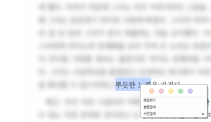 독서할 때의 화면입니다. 드래그 시 나오는 5가지 기능은 전자책 뷰어의 기본이죠. 저는 여기서 "검색"과 "공유" 기능을 잘 쓰고 있는데요. 이 두 기능이야말로 전자책 뷰어를 사용하는 이유가 되지 않을까 싶습니다.