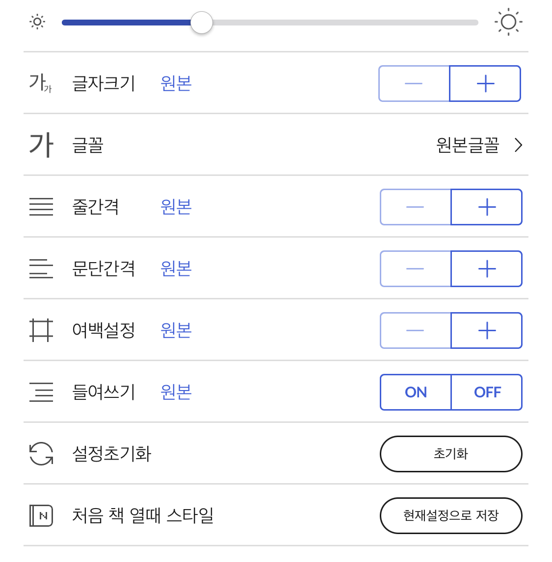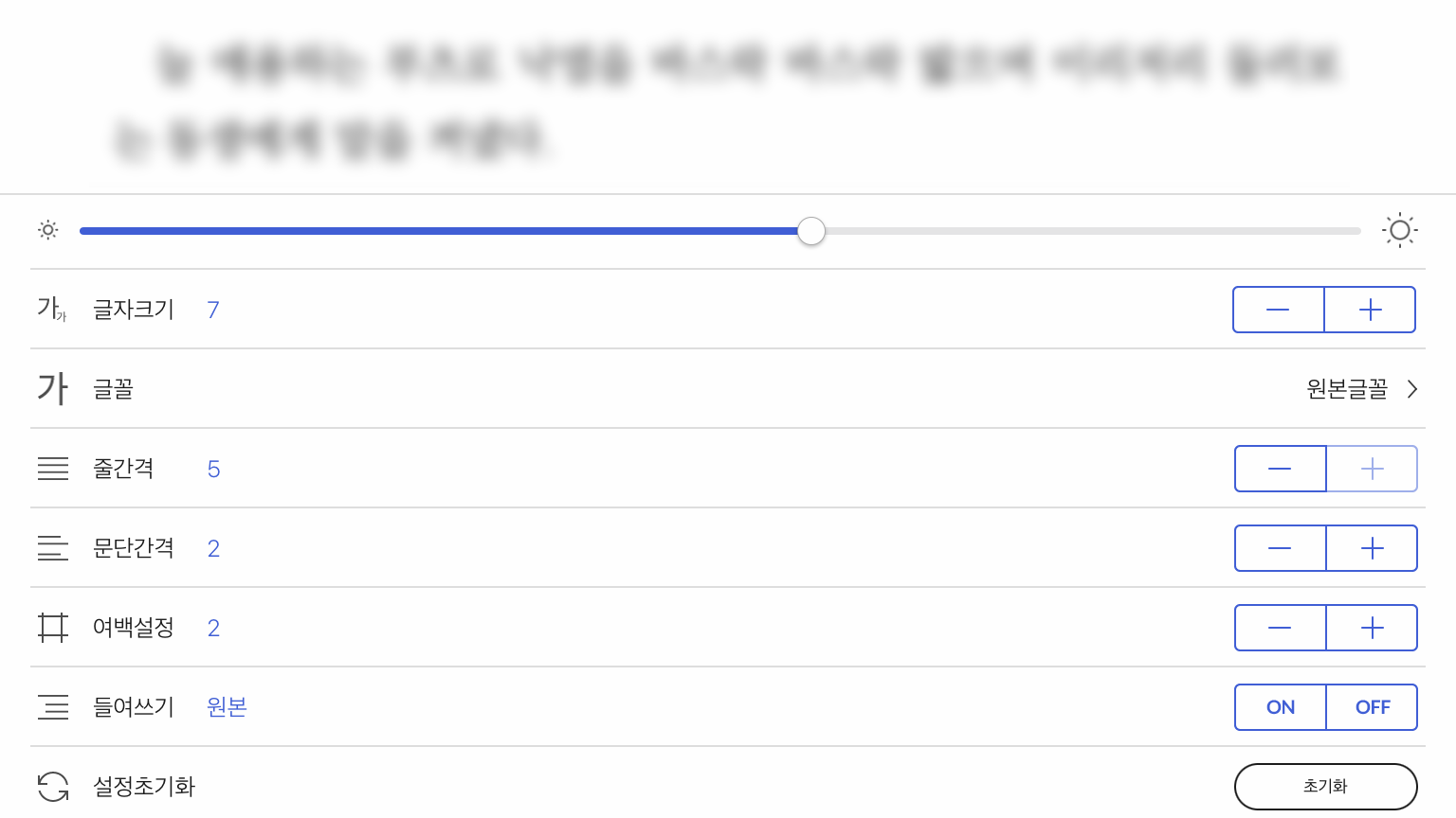 메모는 건너뛰고요. 독서 시 글자 크기, 줄간격, 여백 등을 설정할 수 있는 섹션입니다. 아이폰과 아이패드는 같은 내용을 담고 있습니다. 저는 처음엔 무조건 여백과 글자크기를 바꿉니다. 원본 그 자체는 가독성이 떨어지기 때문이지요.