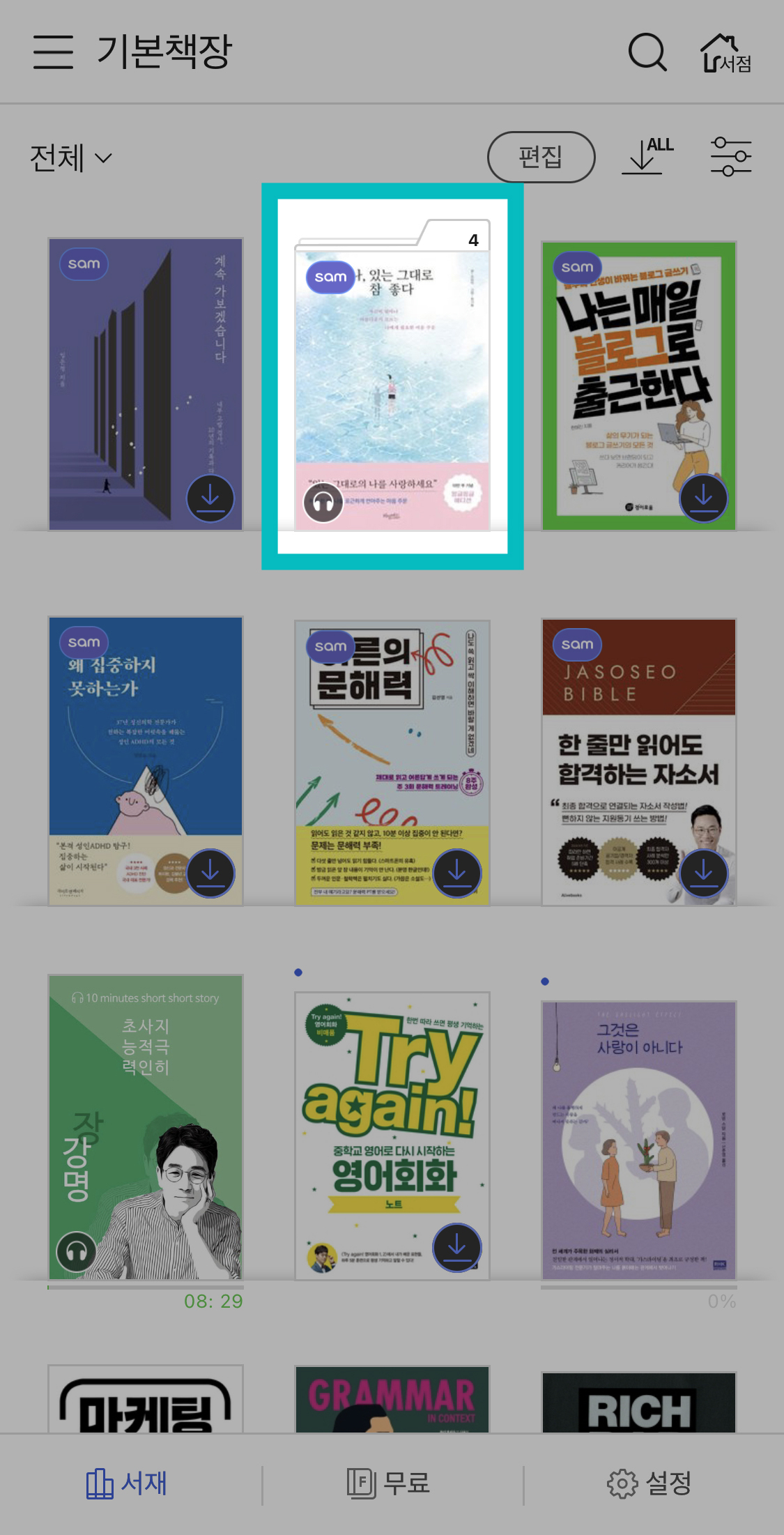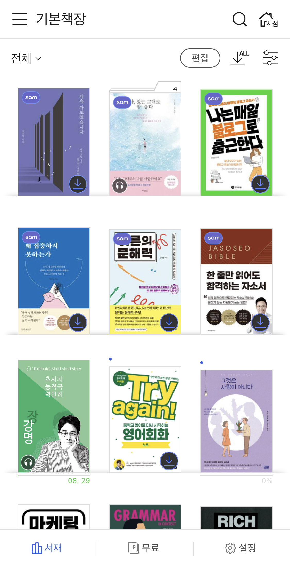 많은 전자책 리더 어플처럼 교보eBook 어플은 굉장히 심플하게 되어 있습니다. 아래에 있는 서재, 무료, 설정 딱 세 개죠. 서재는 어플을 틀었을 때 메인으로 나옵니다. 서재에서는 책장을 분류해서 이름을 부여할 수 있습니다. 저는 분류를 자세하게 할 정도까지는 아니라서 기본 책장으로만 사용 중입니다. 책을 보시면 sam 표시가 붙은 건 sam이용권으로 이용중인 거고요. 그렇지 않는 책들은 대여하거나 구매하거나 무료라서 가지고 있는 책들입니다. (아래에 더 있는데 그건 패스!)