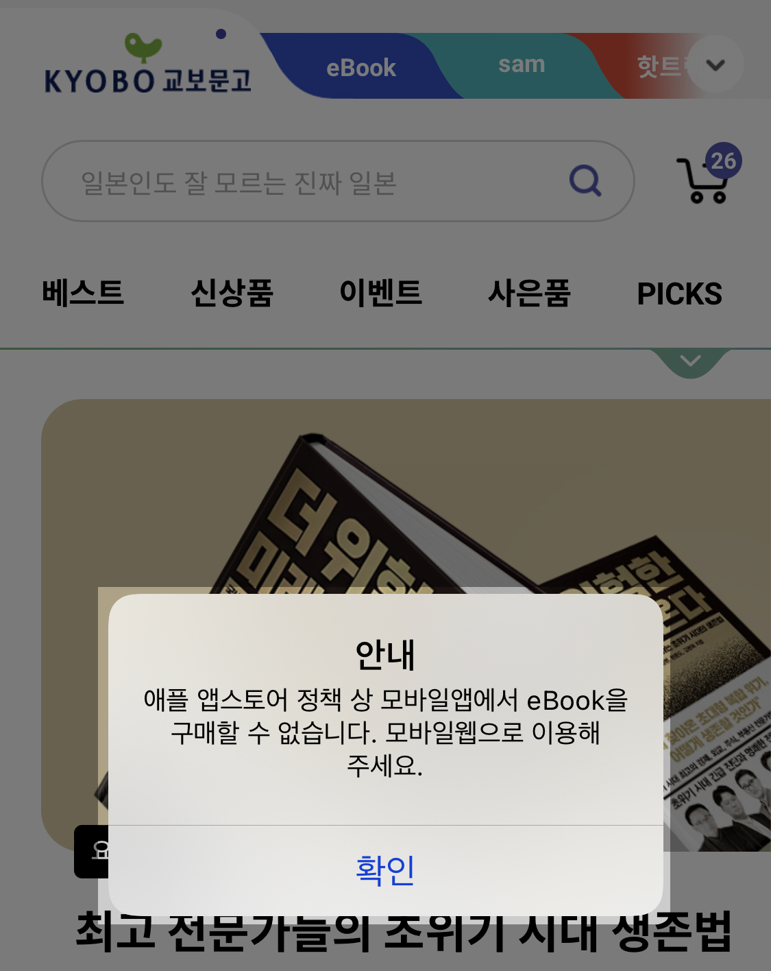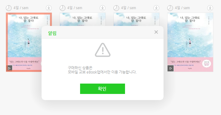 저는 아이폰과 아이패드를 사용합니다. 요 기기들로 sam이나 단순 eBook 구매/대여를 하는 데 제한이 있습니다. 애플의 앱스토어 정책 때문이죠. 아이폰으로 평소처럼 교보문고 어플에 들어가서 eBook이나 sam으로 들어가려하면 메시지가 나타납니다. 참 불편합니다.