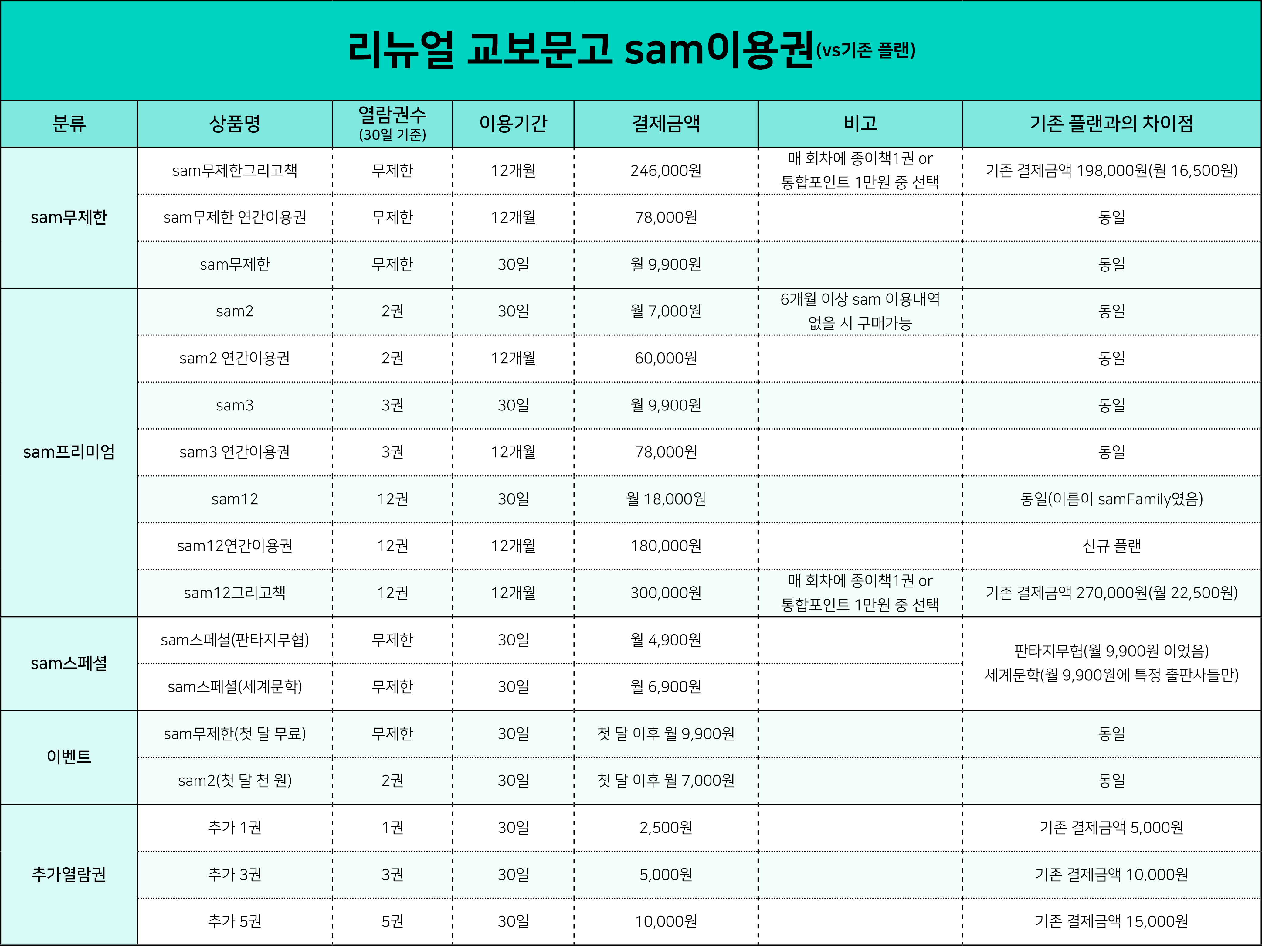 기존에 sam베이직이었던 현 sam프리미엄에는 일부 정리해고가 있었습니다. 이전에는 월 5권 혹은 7권을 빌려볼 수 있는 sam5와 sam7이 있었는데요. 이번 리뉴얼을 통해 정리되었습니다. sam베이직을 좋아하던 저로써도, 비록 sam베이직에서 볼 수 있는 책을 sam무제한에서 못 보는 경우가 있긴 해도 매월 5권이나 7권을 낼 바에야 sam무제한을 선택할 것 같더라고요. 이용하시던 분들께서는 아쉬움을 느끼시겠지만 괜찮은 가지치기라고 생각했습니다.(기존 요금제를 보시려면 아래 포스팅을 참고해주세요.)