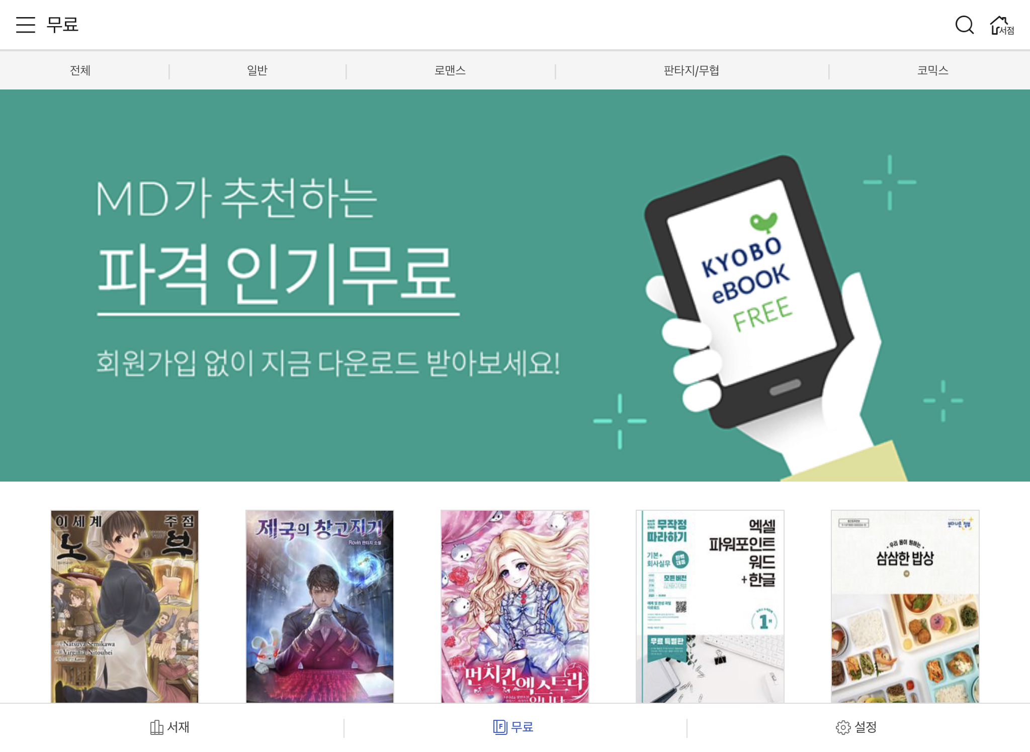 무료 섹션은 잘 들여다보지 않는 곳입니다. 아주 가끔 읽을 만한 책들이 전시되기는 하는데요. 대부분의 장르가 제가 아예 관심없는 류라서 지나갑니다.