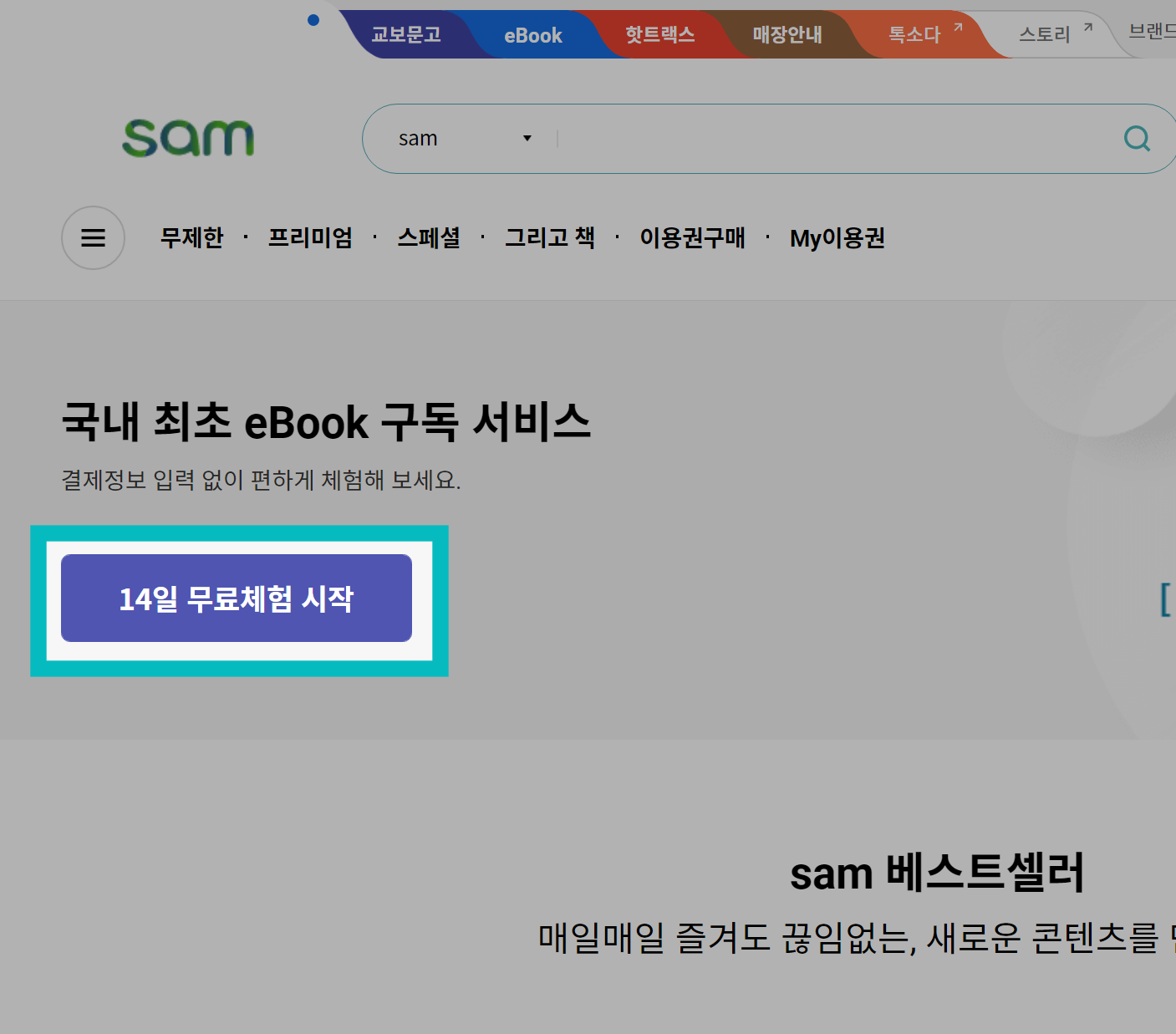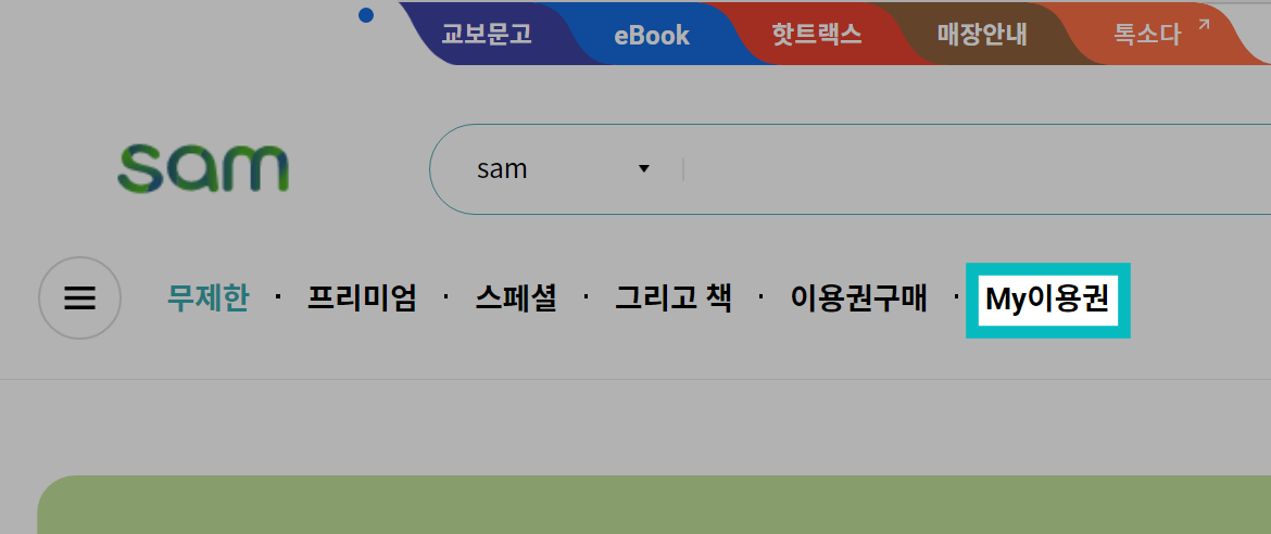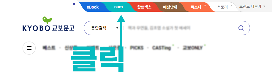 홈페이지 상단에 색깔별로 책갈피처럼 마크가 되어 있습니다. eBook-sam-핫트랙스-매장안내-톡쏘다-스토리 순으로 되어 있는데요. 여기서 sam을 눌러줍니다.