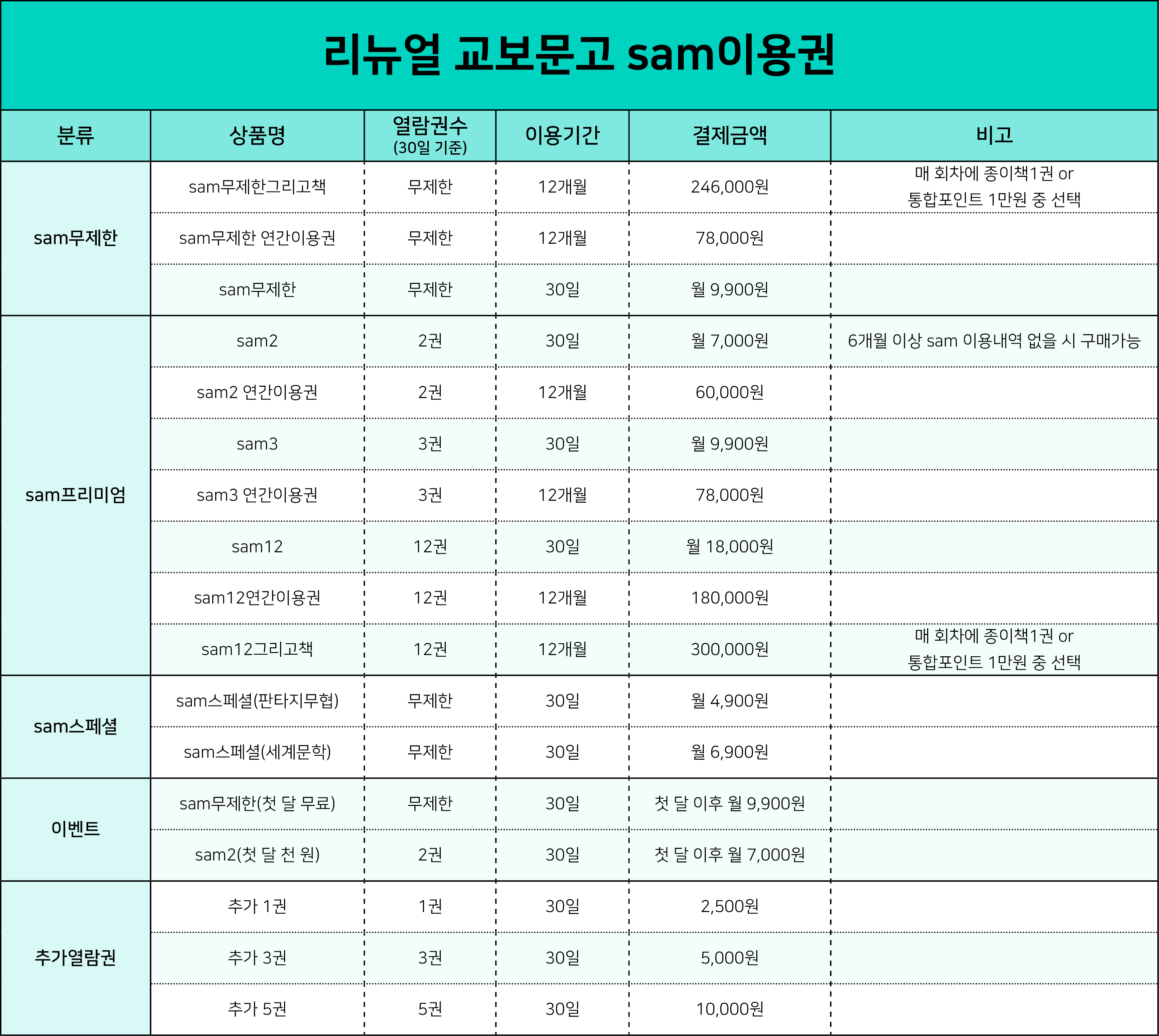사실 이름이 바뀐 만큼 이용권에 대대적인 변신이 있던 것은 아닙니다. sam베이직에서는 불필요했던 sam5와 7, Family가 사라졌고요. sam Family 종이책 정기배송이 "sam12그리고책"으로 바뀌었는데 가격이 올랐습니다. sam무제한은 매달 종이책 1권이나 통합포인트를 제공받는 이용권의 가격이 올라간 정도입니다. 요약하자면 교보문고는 이번 리뉴얼을 통해 불필요한 상품을 가지치기를 하면서 일부 서비스의 가격을 변동했습니다. (기존 서비스와의 비교표는 [전자책의 모든 것 교보문고 편]을 새롭게 쓰면서 드리겠습니다.)