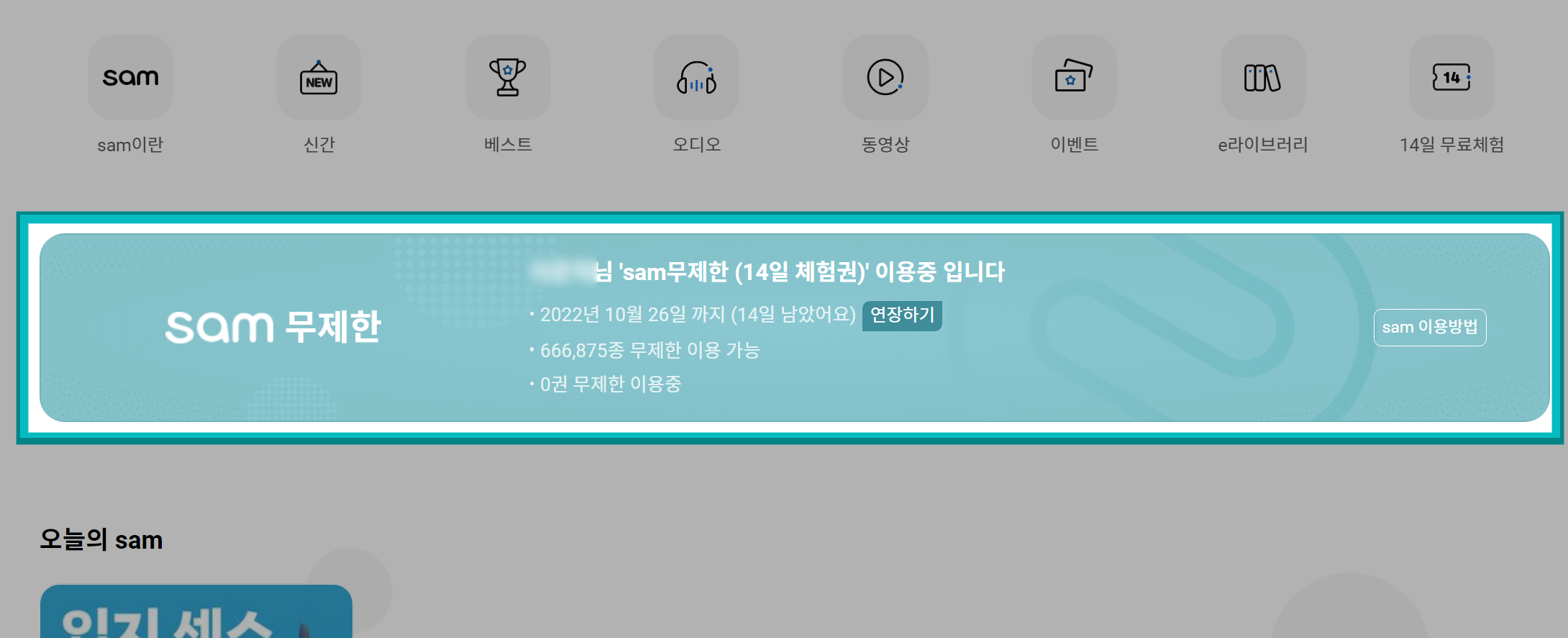 만약 14일 체험을 누리지 못하셨다거나, 교보문고 sam을 결제 없이 이용해보고 싶으신 분들은 아래 방법을 천천히 따라하시면 됩니다. (참고로 위에서 말씀드렸듯이 sam무제한을 처음 이용하면 "첫 달 무료"가 가능한데요. 이후 한달 요금이 결제되기 때문에 조심스러우시다면 요 2주 체험을 해보시는 걸 추천드려요.)