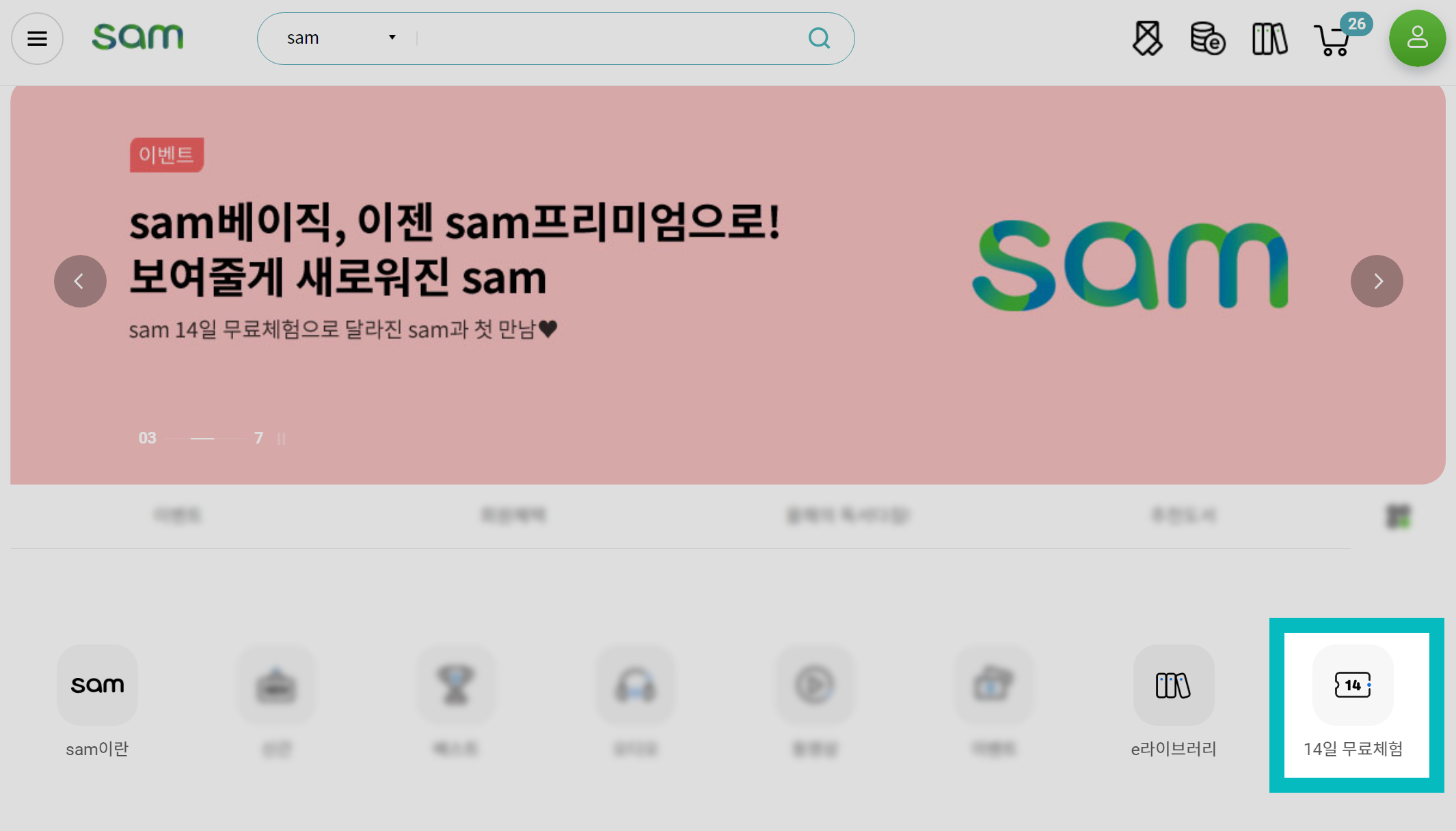 sam페이지에서는 광고 배너 아래에 옹기종기 모여 있는 둥근 네모 버튼을 확인합니다. 여기서 끝쪽에 14일 무료체험 버튼이 있고요. 이걸 누르시면 됩니다.
