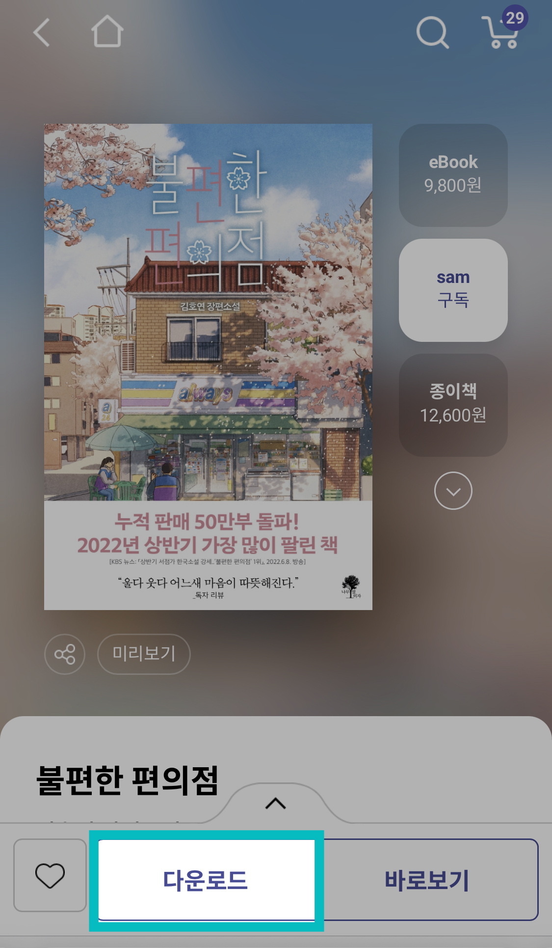 앞서 제가 고른 「불편한 편의점」을 기준으로 말씀드리겠습니다. 검색이든 큐레이션이든 책 표지를 눌러서 들어간 세부페이지 하단에 버튼이 있습니다. "다운로드"와 "바로보기"가 있는데요. 현재 아직 시스템이 불안해서인지 "바로보기"는 잘 작동하지 않았습니다. 또한 "바로보기" 버튼이 없는 경우도 있습니다. 기준은 저도 잘 모르겠네요. 어쨌든 다운로드를 먼저 받습니다.