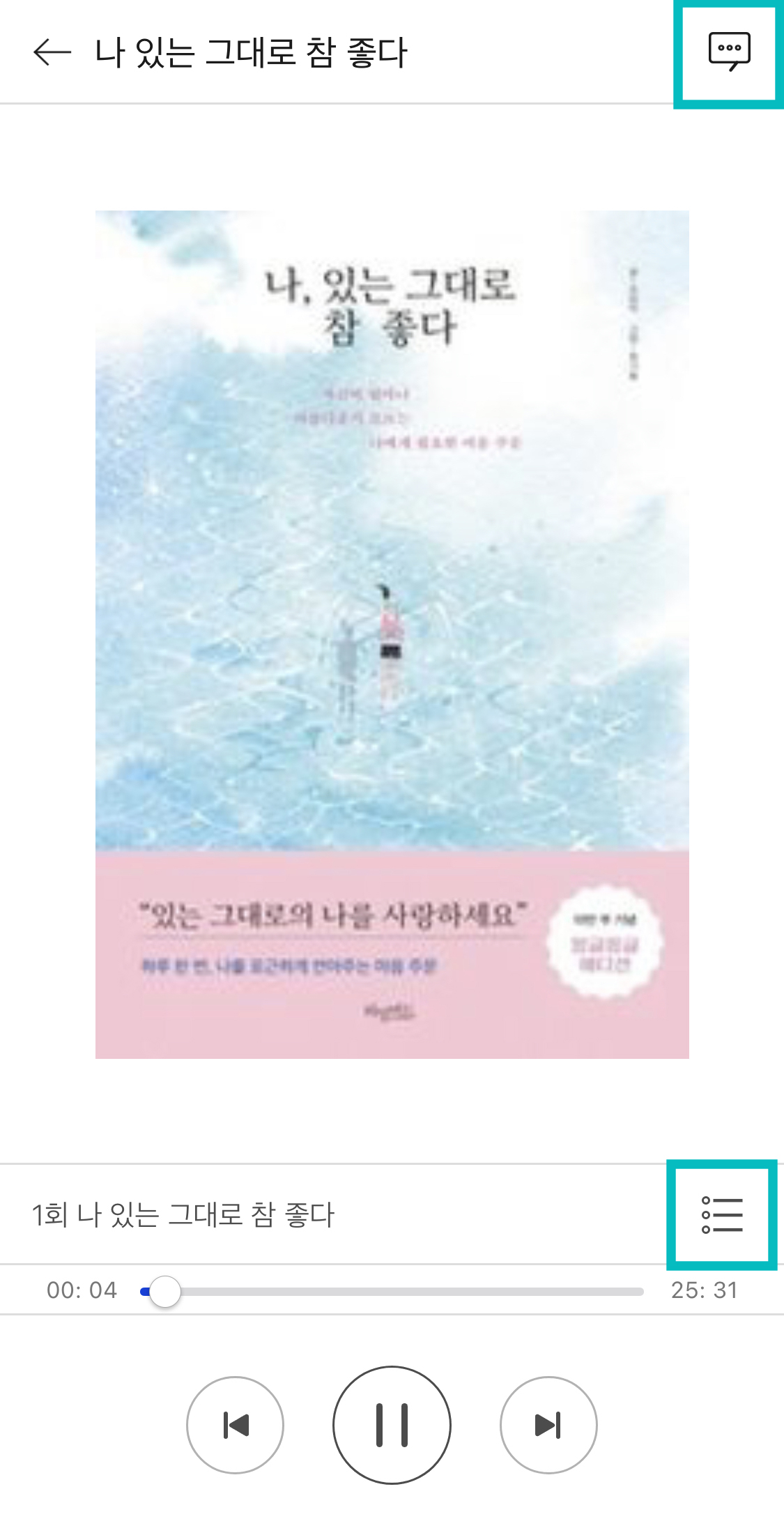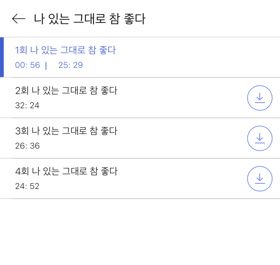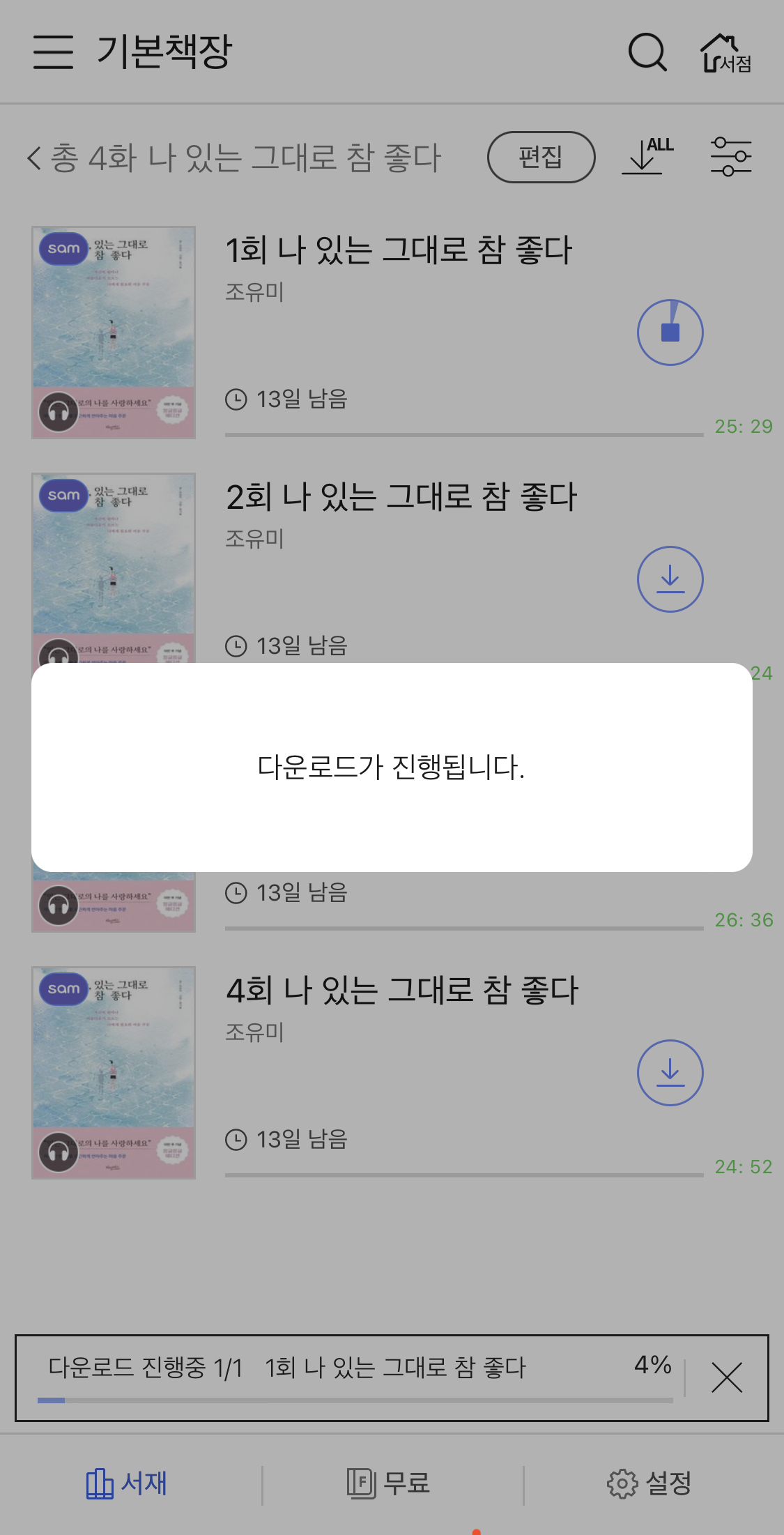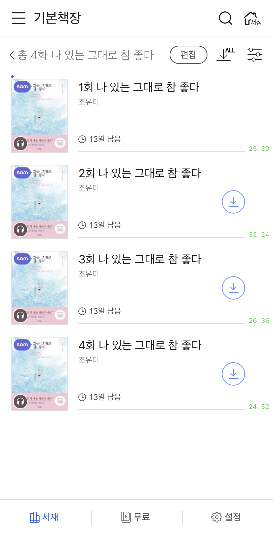 왼쪽 이미지의 「나, 있는 그대로 참 좋다」를 보시면 표지 우측 상단에 "4"라는 숫자가 있지요. 이건 해당 오디오북이 4회로 구성되어있다는 의미입니다. 누르고 들어가시면 4회 분량으로 나뉘어져 있죠. 각각의 것을 다운받아서 들으시면 됩니다.
