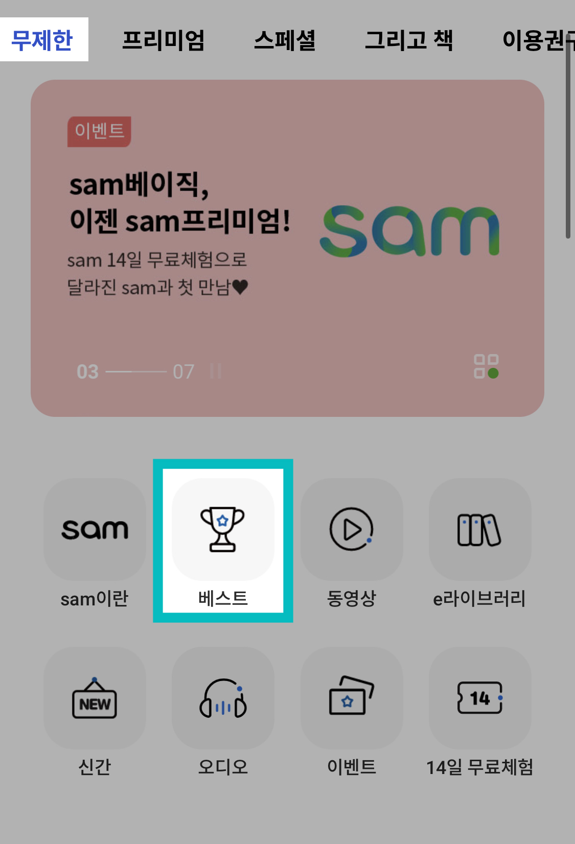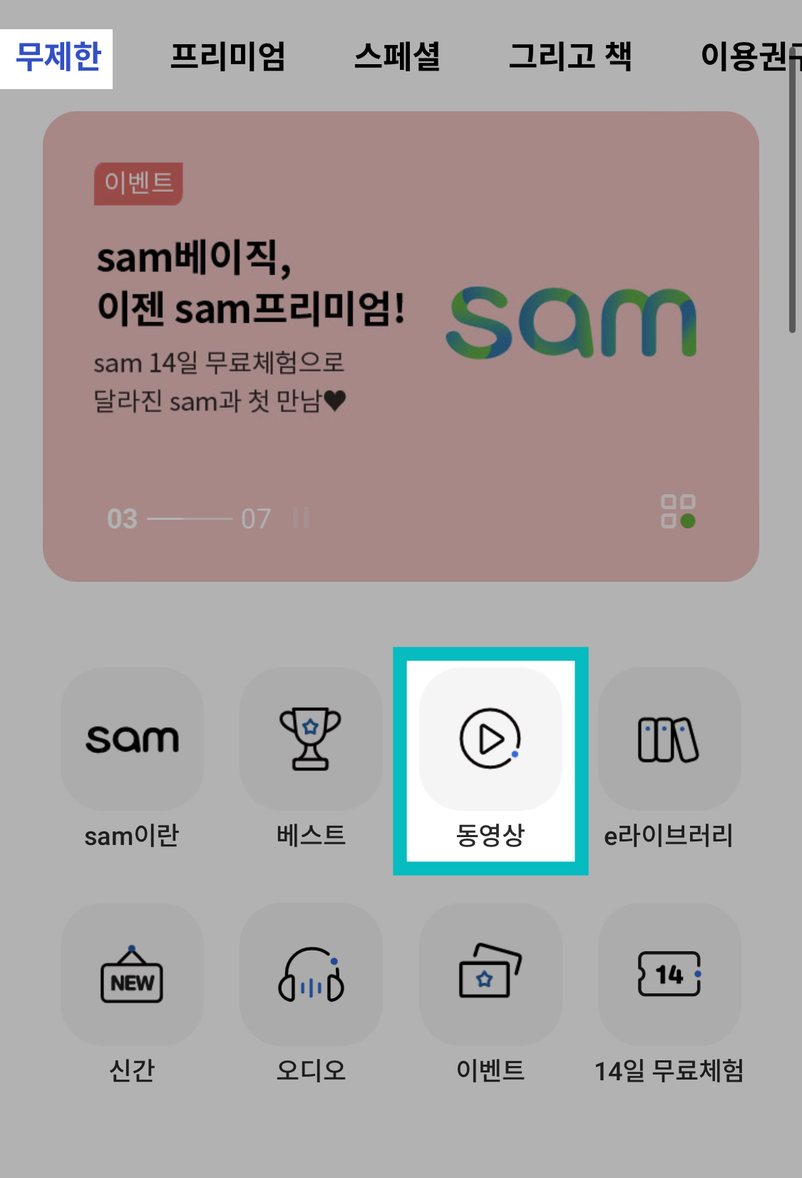 리뉴얼이 된 지 얼마되지 않은 현재 아이폰과 아이패드에서 바로 보이는 sam화면이 다릅니다. 아이패드는 첫 메뉴인 "무제한"이 기본페이지로 되어 있죠. 아이폰을 이용하시는 분은 "무제한"을 누르시고 다음으로 넘어가시면 됩니다. (프리미엄이신 분께서는 프리미엄을 누르시고요!)