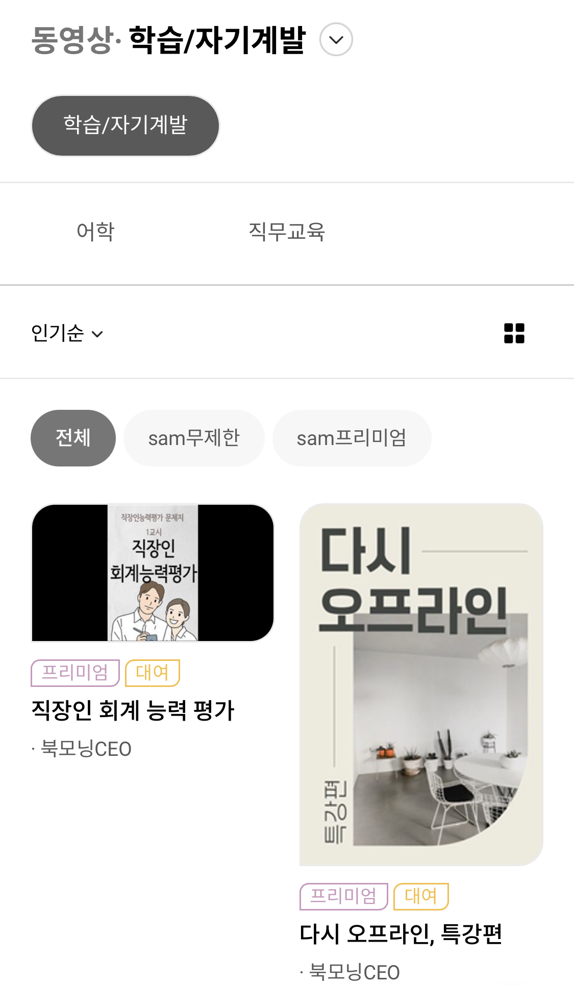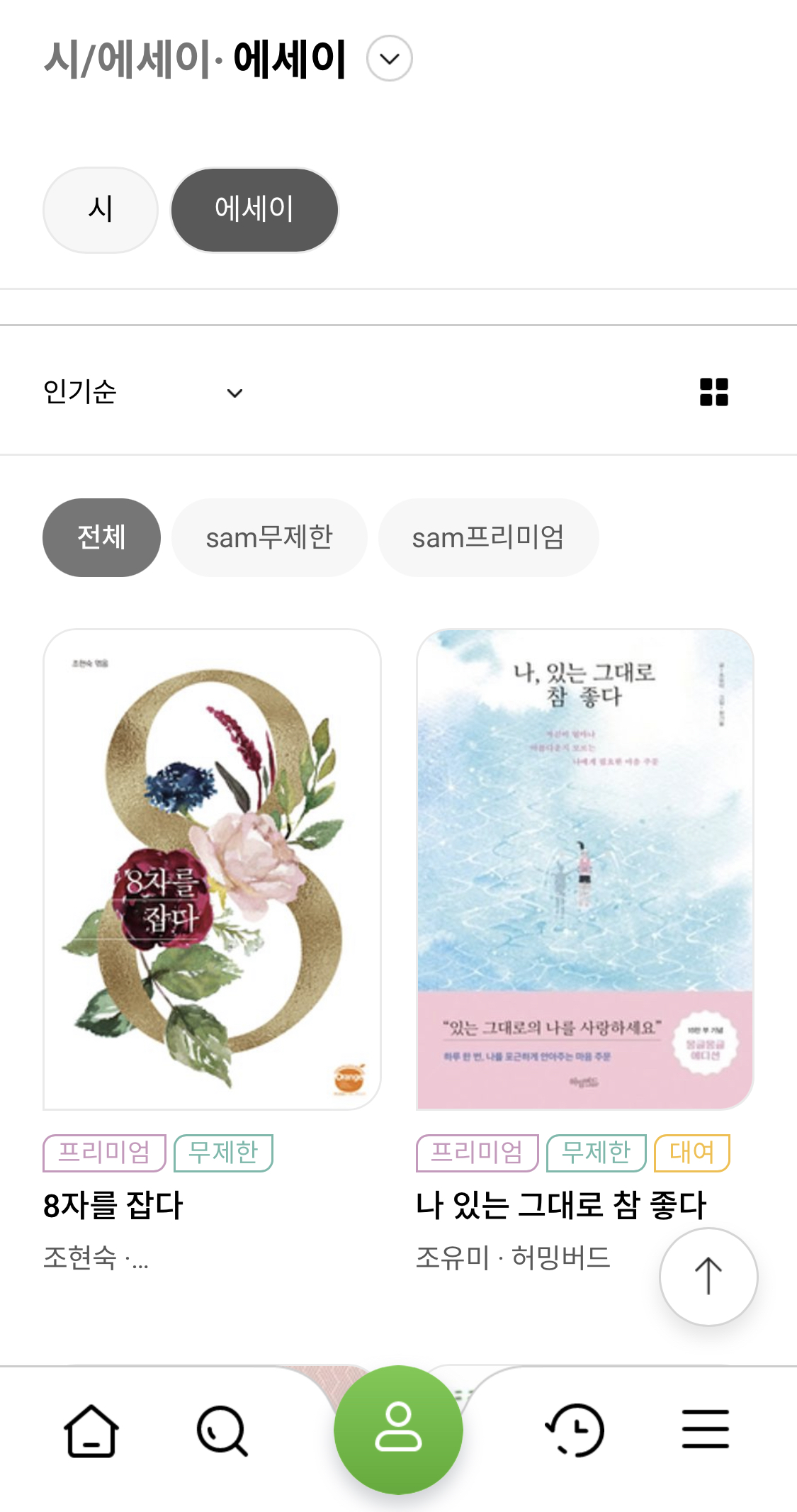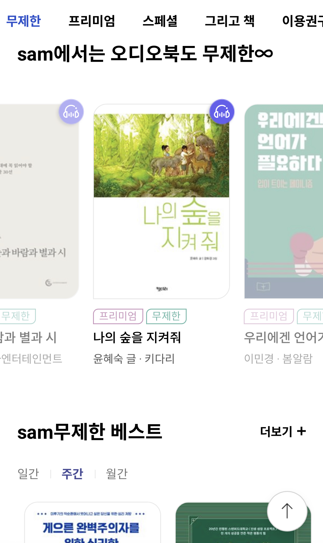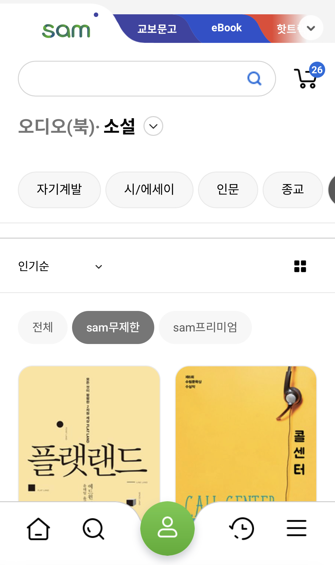 오디오북의 경우 별도의 버튼을 누르고 찾으실 수 있습니다. 페이지가 넘어가면 소설, 시/에세이, 인문, 종교, 자기계발, 등의 분류로 필터링할 수 있습니다. sam무제한이냐 sam프리미엄이냐에 따라서도 솎을 수 있죠.