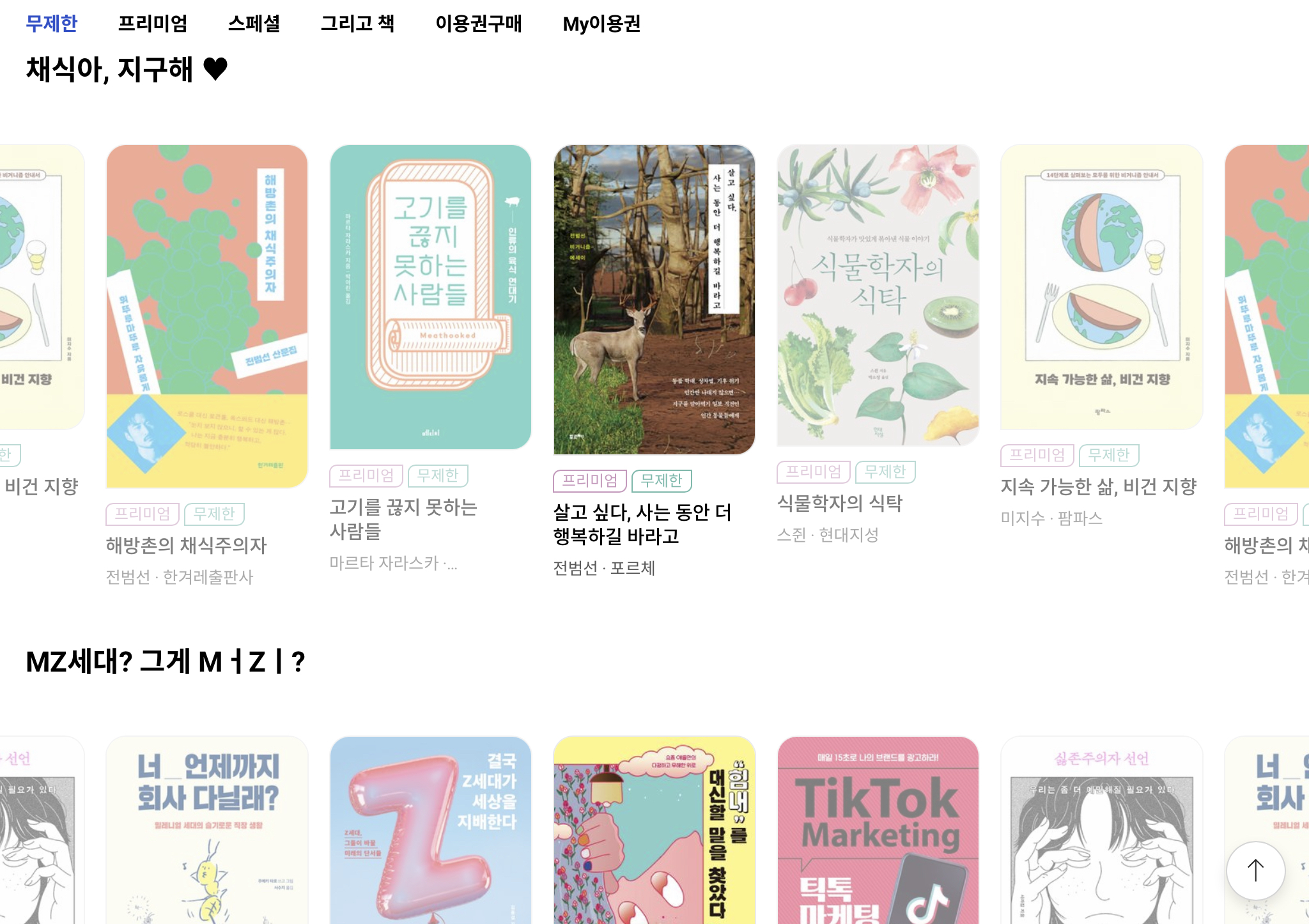 페이지를 내리면 다양한 책들이 보입니다. 베스트와 신간, 오디오북이 있고요. MD들이 큐레이션 하는 섹션도 있습니다. 표지가 바로 나오기 때문에 미리 읽을 책을 조사하지 않으신 분들은 여기서 고르실 수도 있습니다.