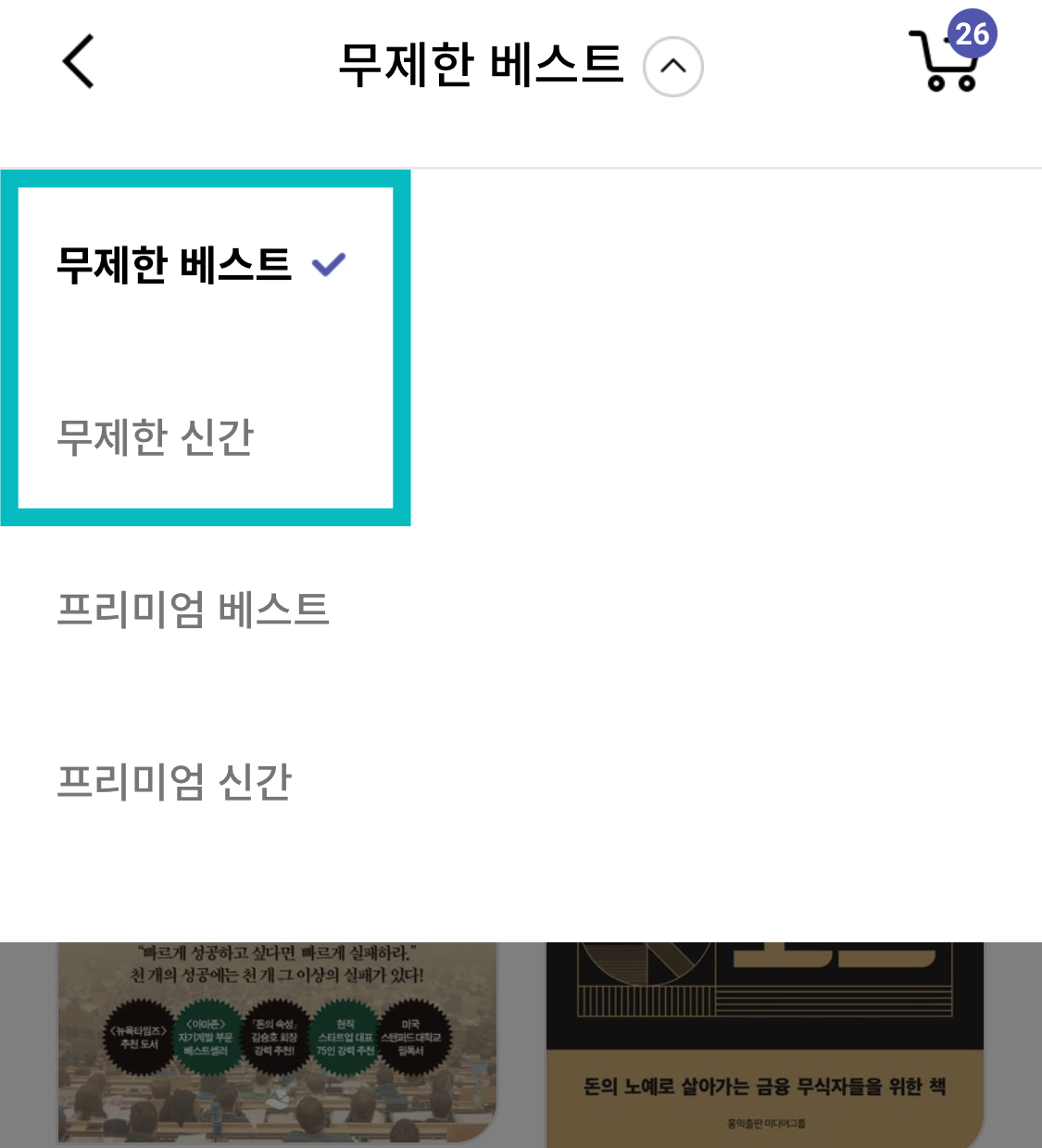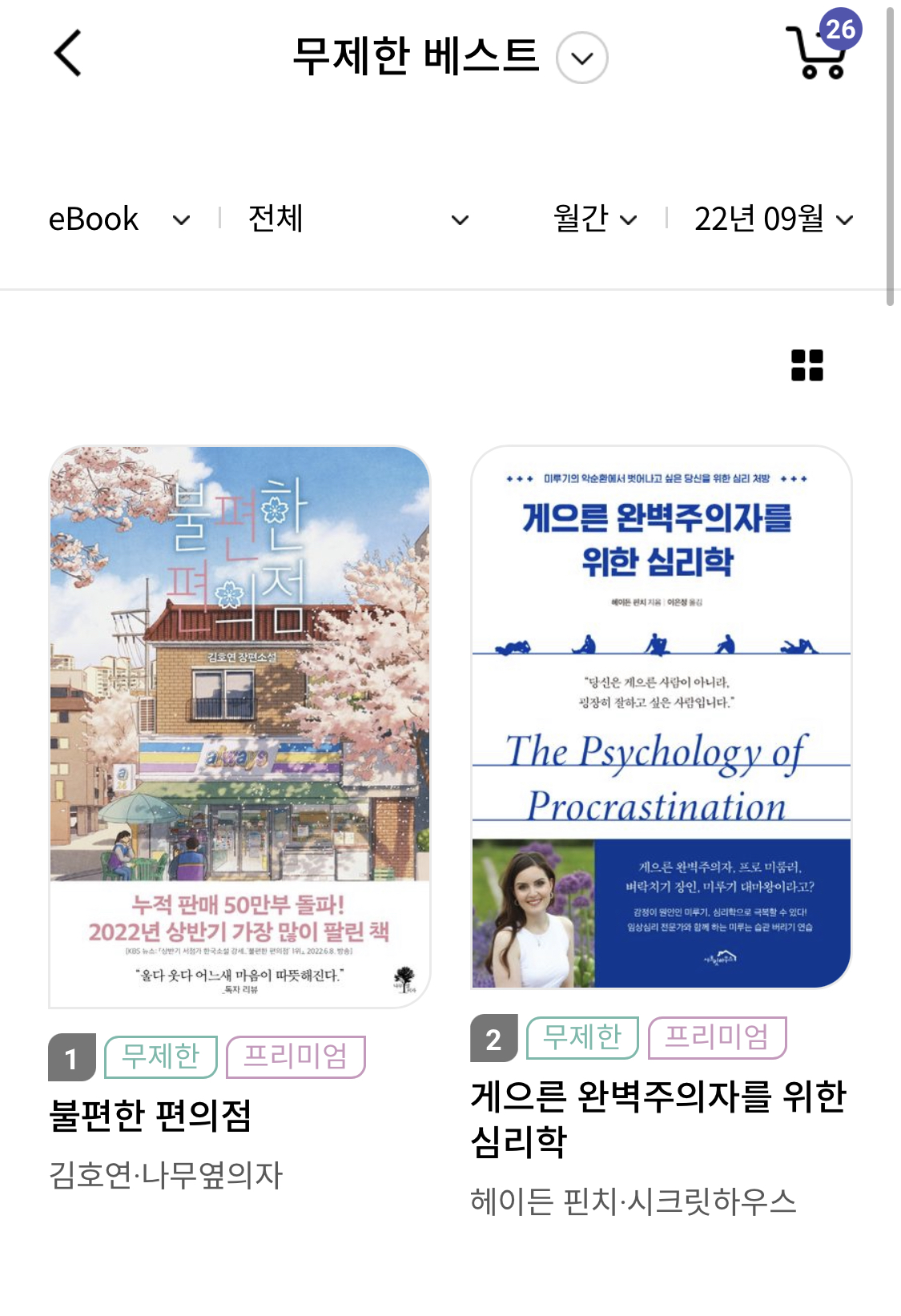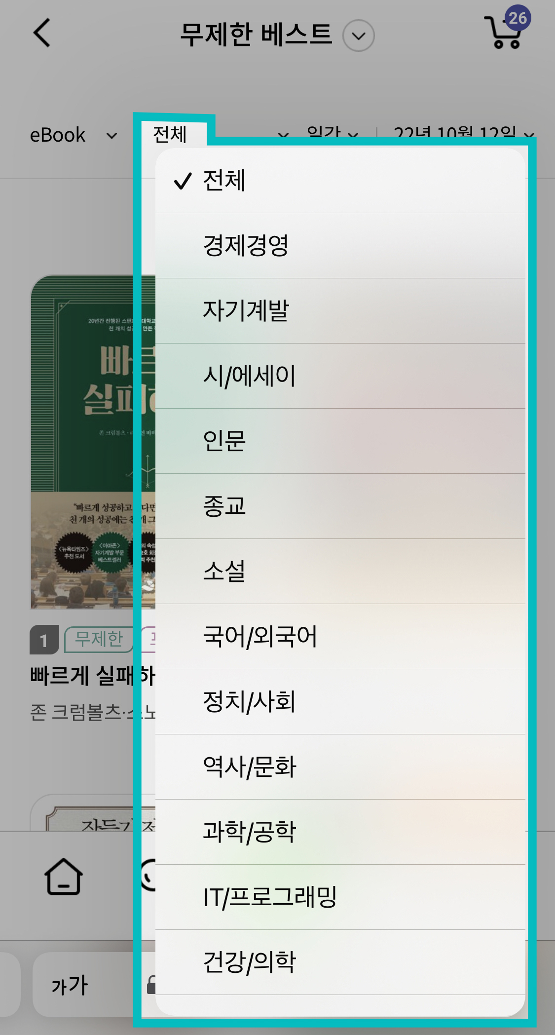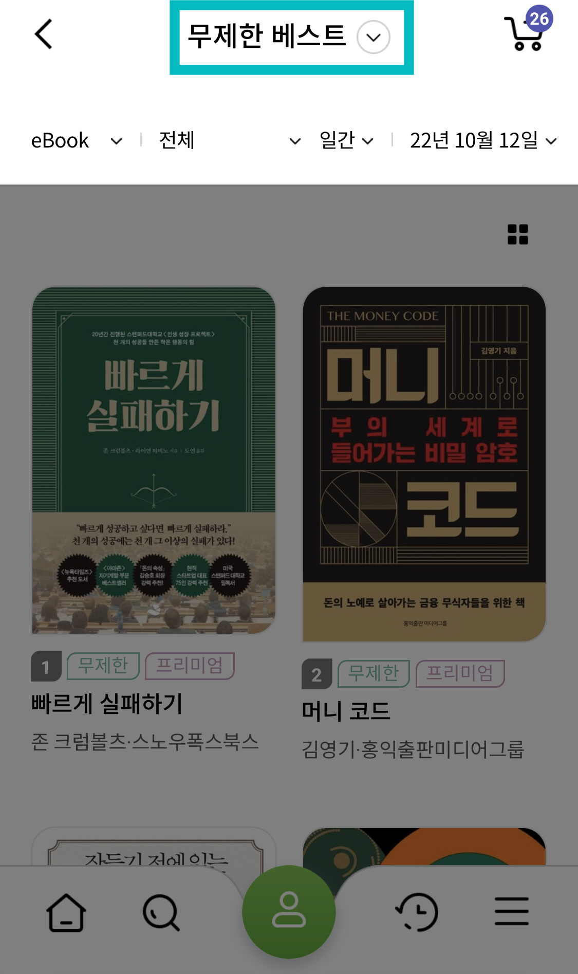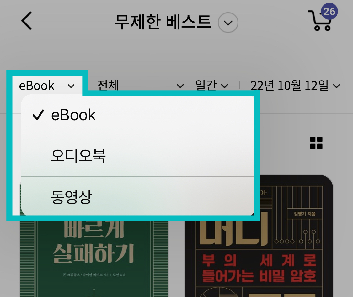 그 아래, 즉 "무제한 베스트"와 책 표지 사이에는 필터가 있습니다. eBook, 오디오북, 동영상 중에 종류를 고르셔도 되고요. 그 오른쪽에서 세부 카테고리를 고르셔도 좋습니다. 일간, 주간, 월간으로도 구분 가능합니다.