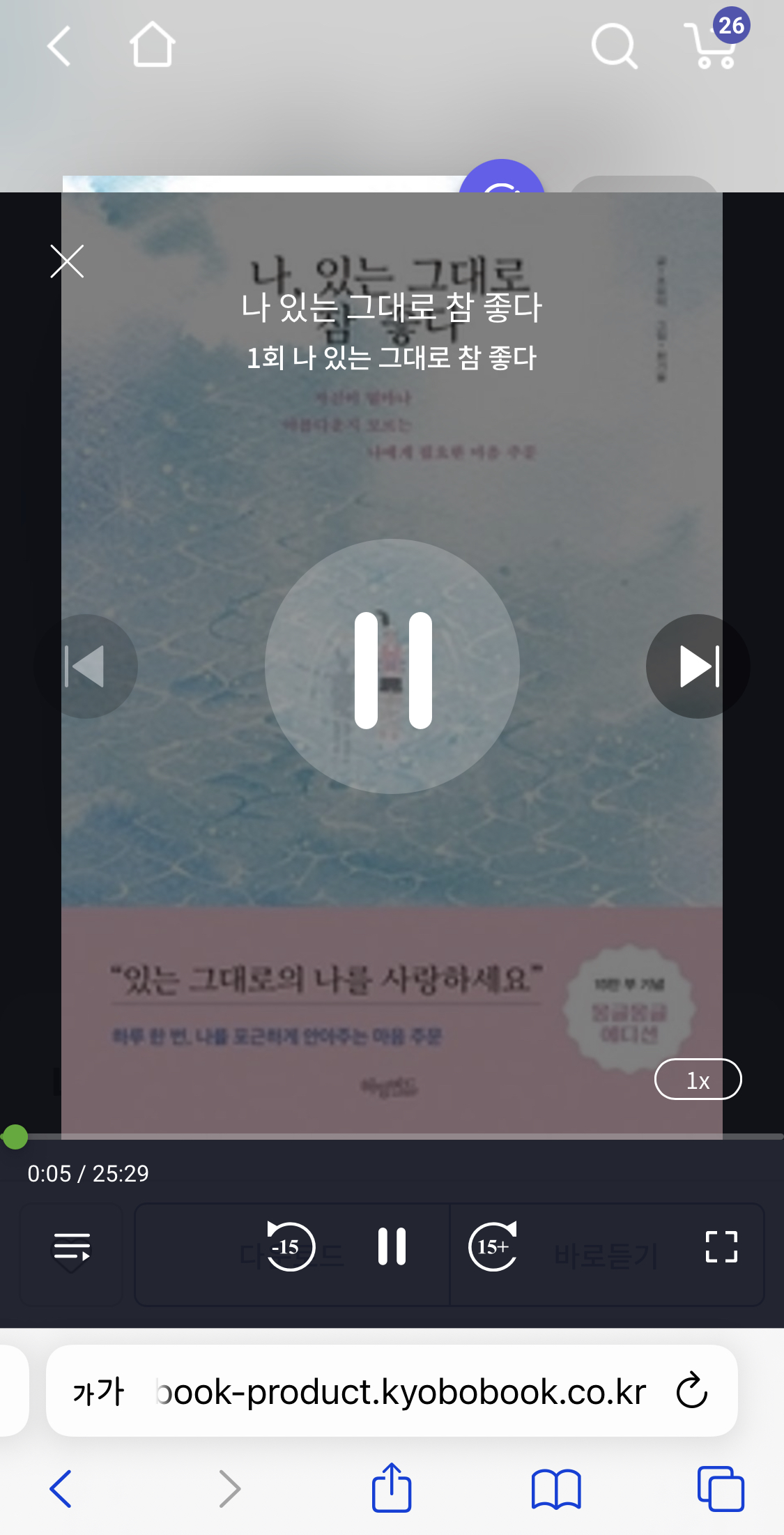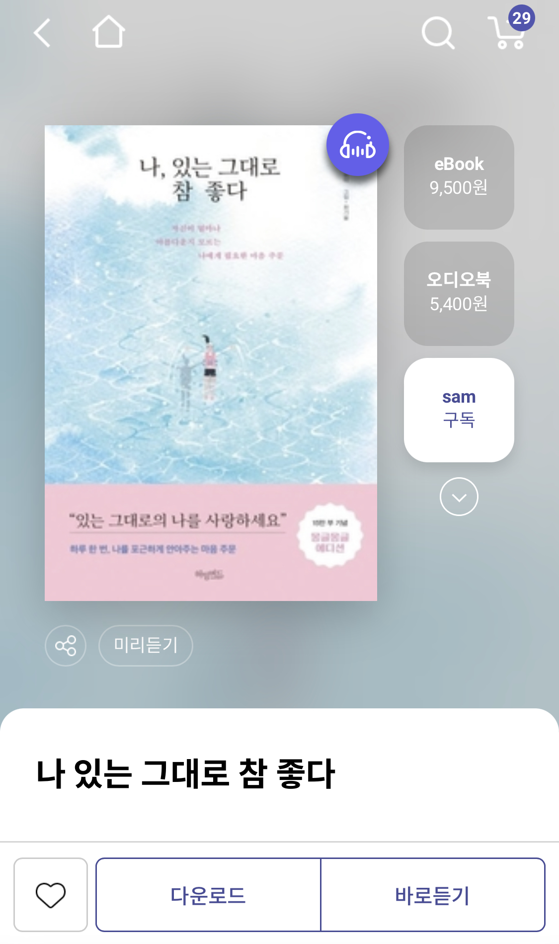 이번에는 다운로드를 해서 교보eBook 어플로 오디오북을 들어보겠습니다. 사파리에서 다운로드를 누르시면 로그인이 된 교보eBook 어플에 자동으로 나타납니다.