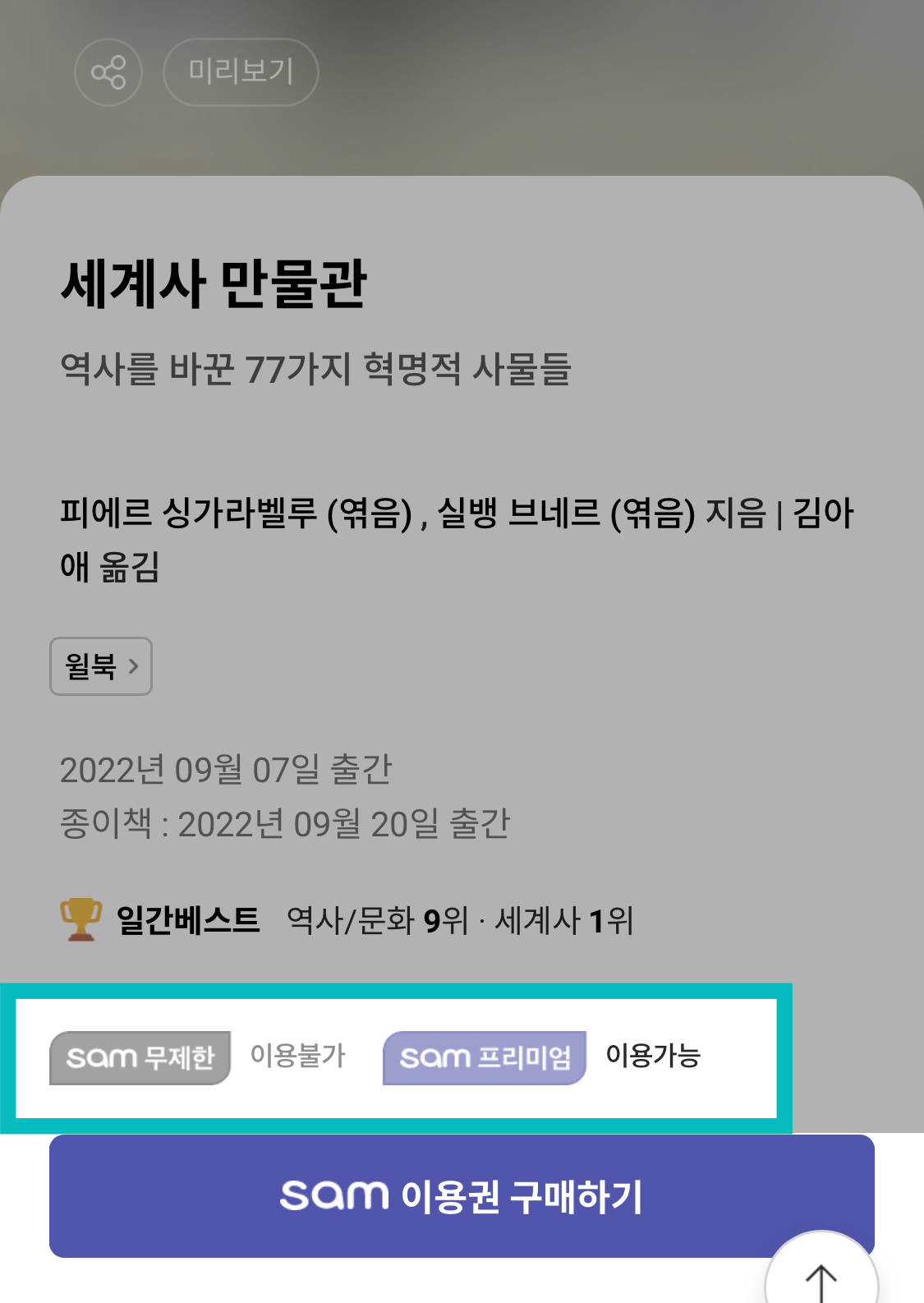 그런데 검색이든 아래의 다른 방법이든 그 책이 내가 구매한 이용권으로 이용할 수 있는지를 확인하셔야 합니다. 출간일 설명 아래에 sam무제한으로 이용 가능한지 여부가 나오거든요. 왼쪽 책은 무제한이든 프리미엄이든 다 이용할 수 있습니다. 반면 오른쪽 책은 프리미엄만 이용할 수 있지요. 제가 sam무제한 요금제를 사용 중이기 때문에 프리미엄에 해당하는 「세계사 만물관」은 이용불가로 표시됩니다. 그 아래 "이용권 구매하기"만 보아도 이 책을 현재로써는 무제한 이용자가 읽을 수 없다는 걸 알 수 있습니다.