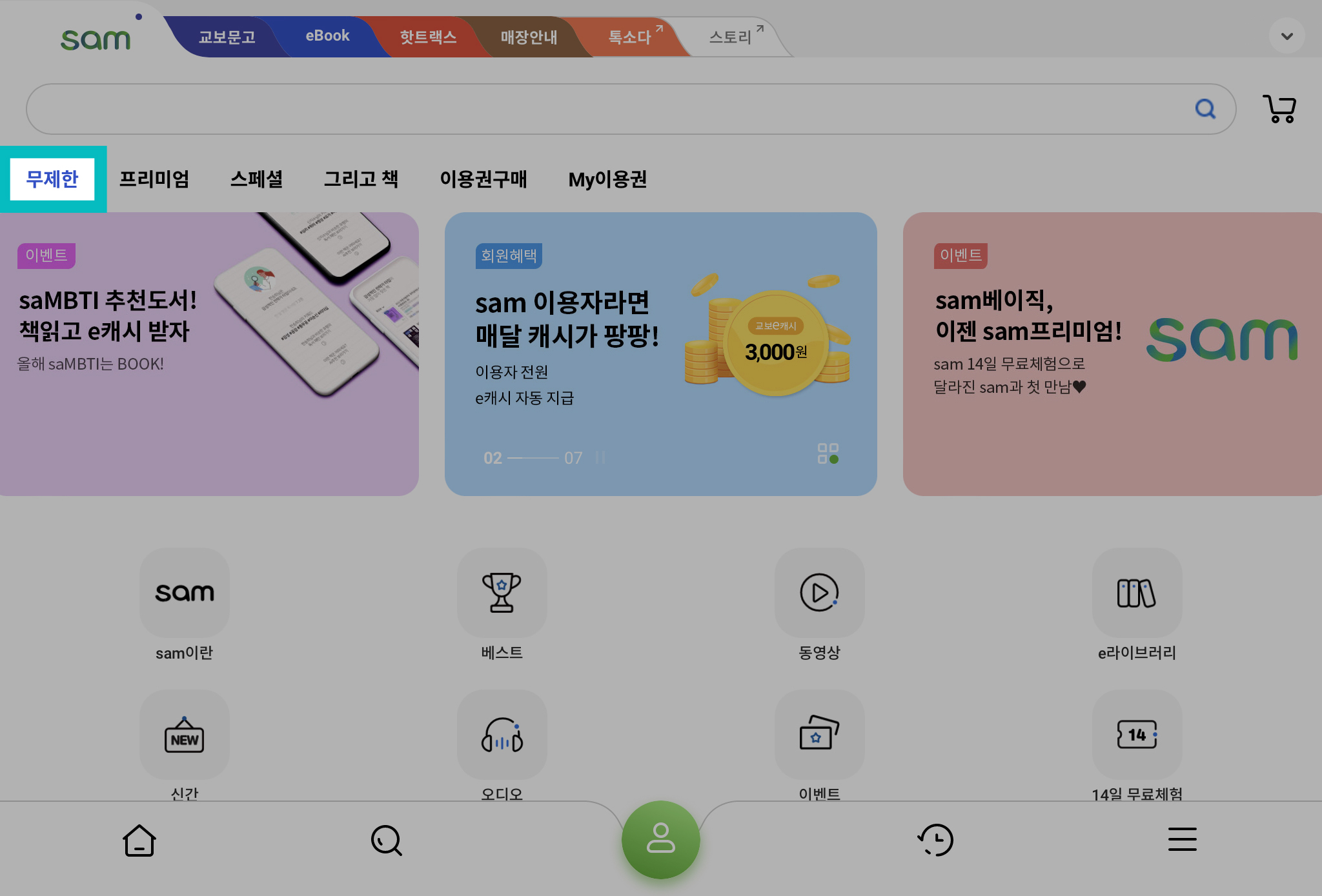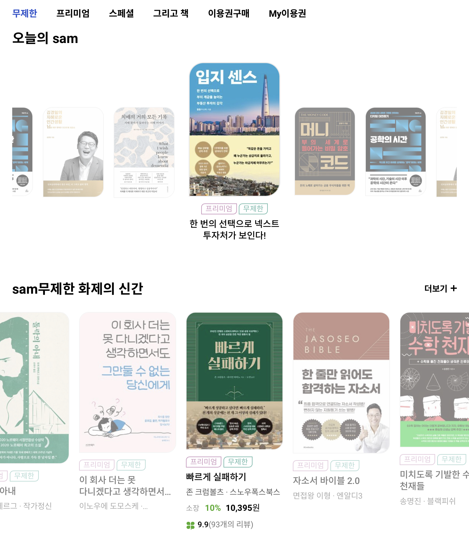 그래도 어플과 홈페이지의 인터페이스가 달라졌습니다. 이게 오늘의 목적입니다. sam무제한과 sam프리미엄을 교보문고 어플에서 어떻게 이용하면 좋을지 소개하려고 합니다. 기본적으로 무제한 이용권을 중심으로 말씀드립니다. sam프리미엄이 무제한과 이용방법 측면에서는 크게 다르지 않기 때문입니다.