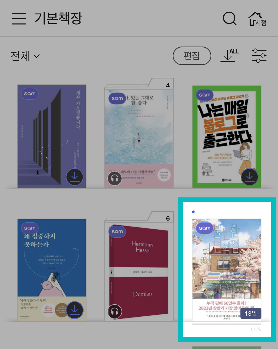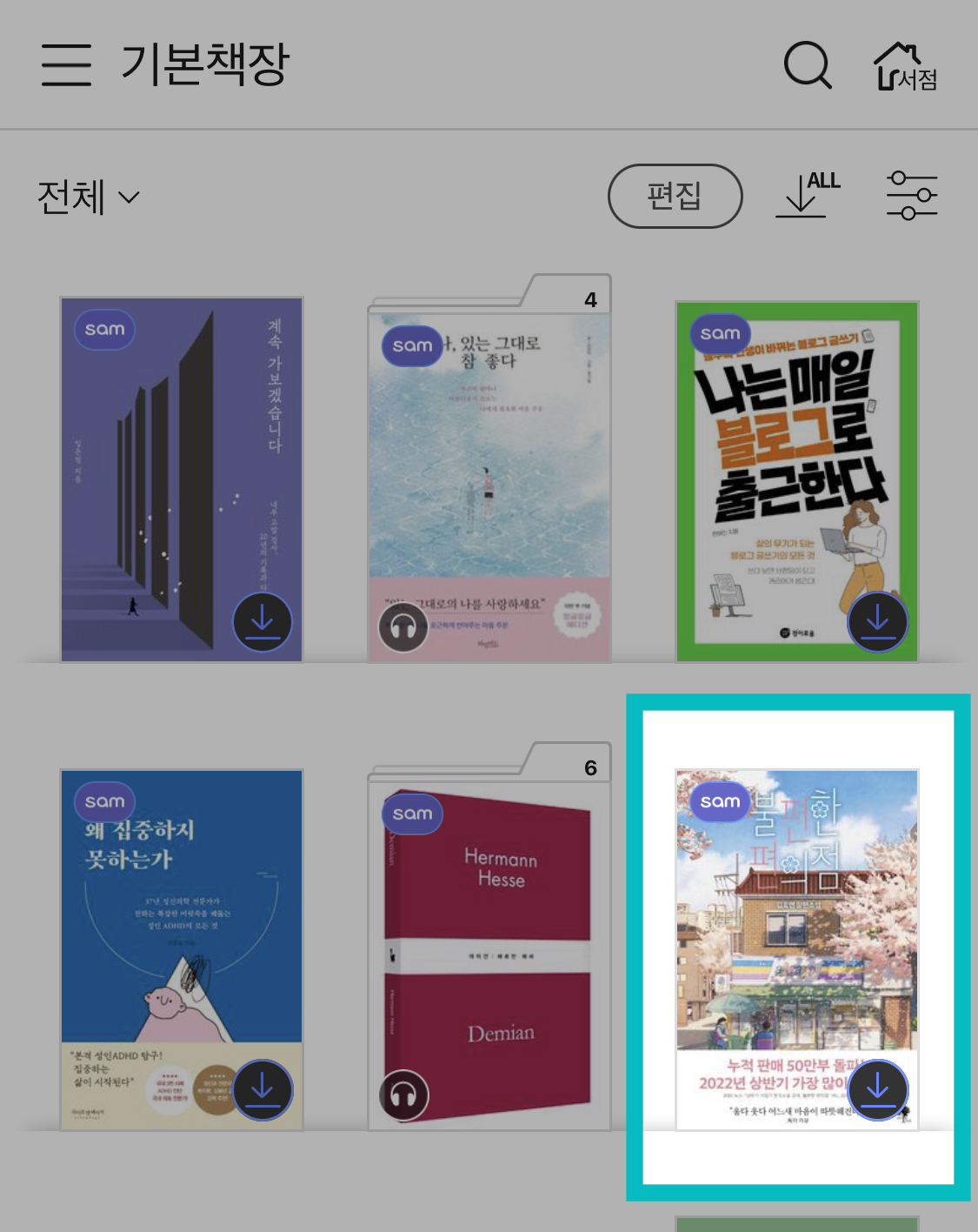 보통 기본 책장이 메인으로 되어 있을 텐데요. 책장을 보시면 다운 받은 「불편한 편의점」표지가 있습니다. 표지 우측 하단에는 다운로드 받아야 한다는 아이콘이 있죠. 표지를 누르시면 다운로드가 됩니다. 만약 책장에 표지가 보이지 않을 시 책장 화면 (대략) 가운데 영역을 누른 채로 아래로 당기면 새로고침이 됩니다.