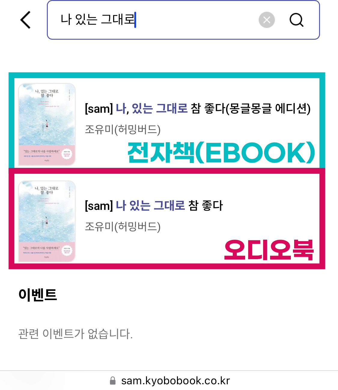 sam무제한은 sam프리미엄과 같이 eBook, 오디오북, 동영상 콘텐츠를 제공합니다. 그 무엇이든 제일 쉽게 찾는 방법은 검색을 통해서입니다. 화면 상단에 검색 영역이 있죠. 여기서 원하는 책을 검색해보시면 됩니다. 예를 들어 저는 조유미 님의 「나, 있는 그대로 참 좋다」를 찾아보겠습니다.