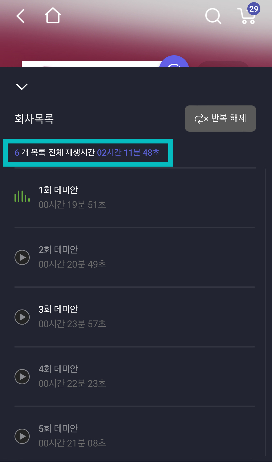오른쪽 이미지는 목록 버튼을 눌렀을 때의 화면입니다. 「데미안」이 6개의 음성, 총 2시간 이상의 길이로 되어 있음을 알 수 있습니다. 반복재생을 설정하지 않는 이상 다음 회차로 넘어가죠. 참고로 오디오북을 틀어둔 채로 잠시 화면을 꺼두어도 계속 재생이 됩니다.
