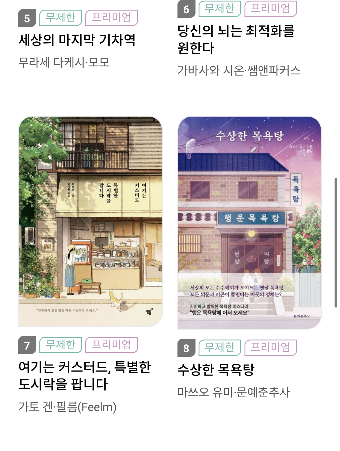 저는 월간으로 구분해서 eBook을 살펴보았습니다. 그리고 세 책을 골랐죠. 「불편한 편의점」, 「여기는 커스터드, 특별한 도시락을 팝니다」, 「수상한 목욕탕」을요. 요즘은 「나미야 잡화점」이나 「달러구트 꿈 백화점」처럼 가게를 제목으로 한 소설이 유행인 것 같습니다. 가슴이 따뜻해지는 내용처럼 보이는데 읽어봐야 제대로 알 것 같습니다.