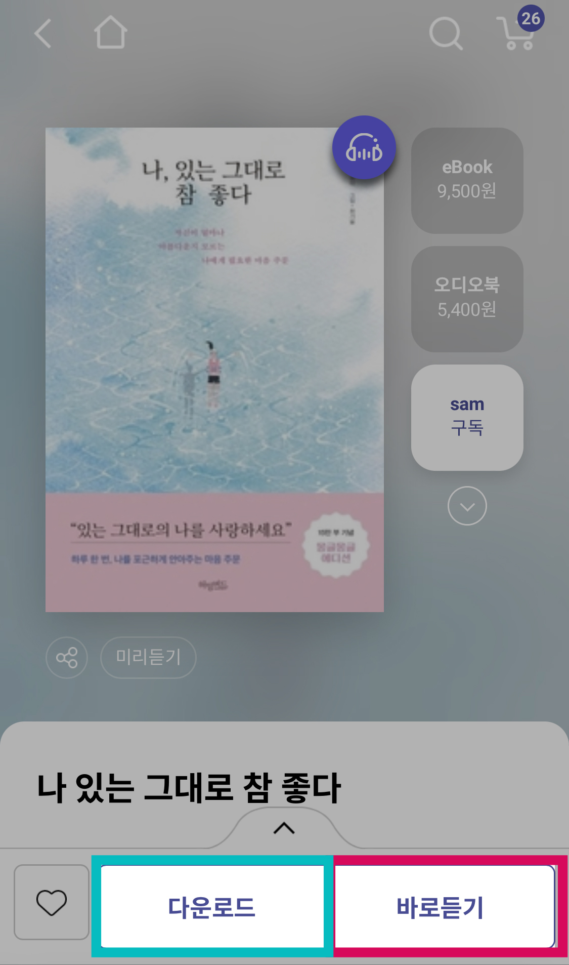 오디오북을 듣는 방법은 두 가지 입니다. 1)다운로드 받아서 교보eBook 어플에서 듣기, 2)웹브라우저에서 바로 듣기가 있죠.