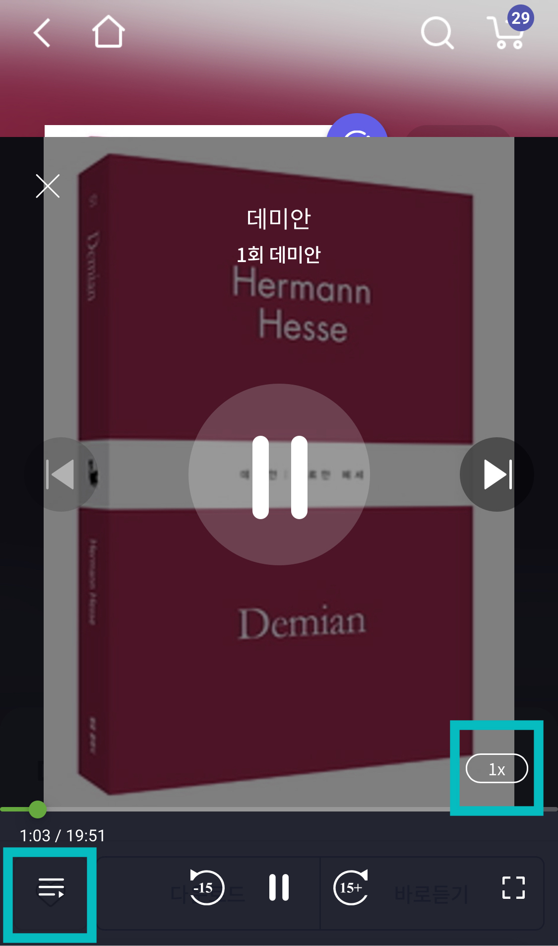 「데미안」이 오디오북으로 있길래 바로 듣기를 해보았습니다. 왼쪽 하단에 보편적인 목록 기능이 있고요. 표지 우측 하단에는 배속 버튼이 있습니다. 목록 버튼 위에는 이 음성파일이 19분 51초라고 표시되어 있죠. 하지만 「데미안」이 이렇게 짧은 시간 안에 읽히지는 않겠죠.