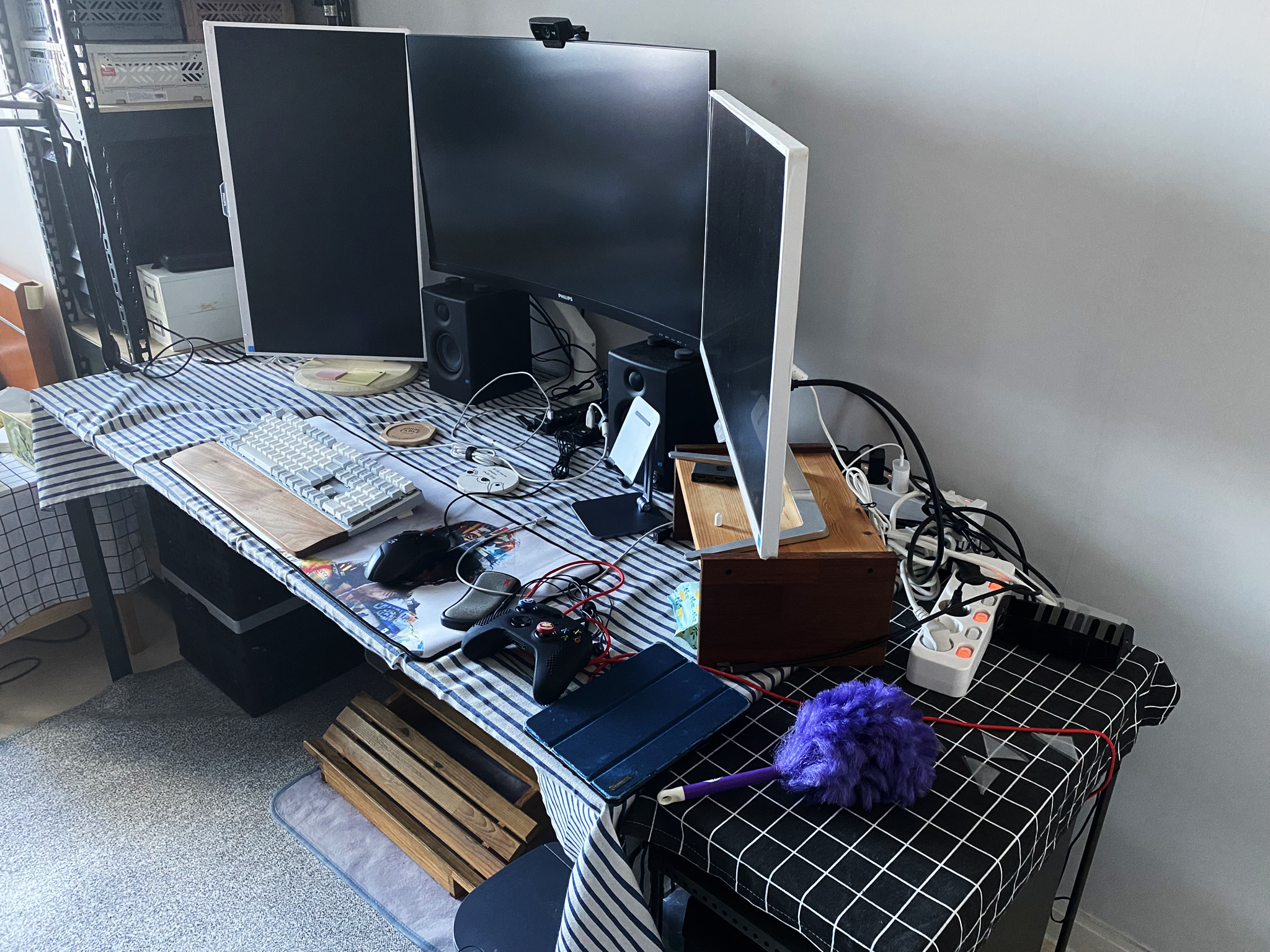 새롭게 데스크 셋업을 하기로 했습니다. 책상 위에 덮인 천을 빼는 것을 필두로 선정리도 조금 하기로 했죠. 그렇지만 제가 더 기다려왔던 게 있습니다. 바로 모니터 받침 위에 있는 모니터에 모니터암을 장착하는 것이었습니다. 그러면 자유도 측면에서나 정리 측면에서나 도움이 될 거라고 보았습니다.