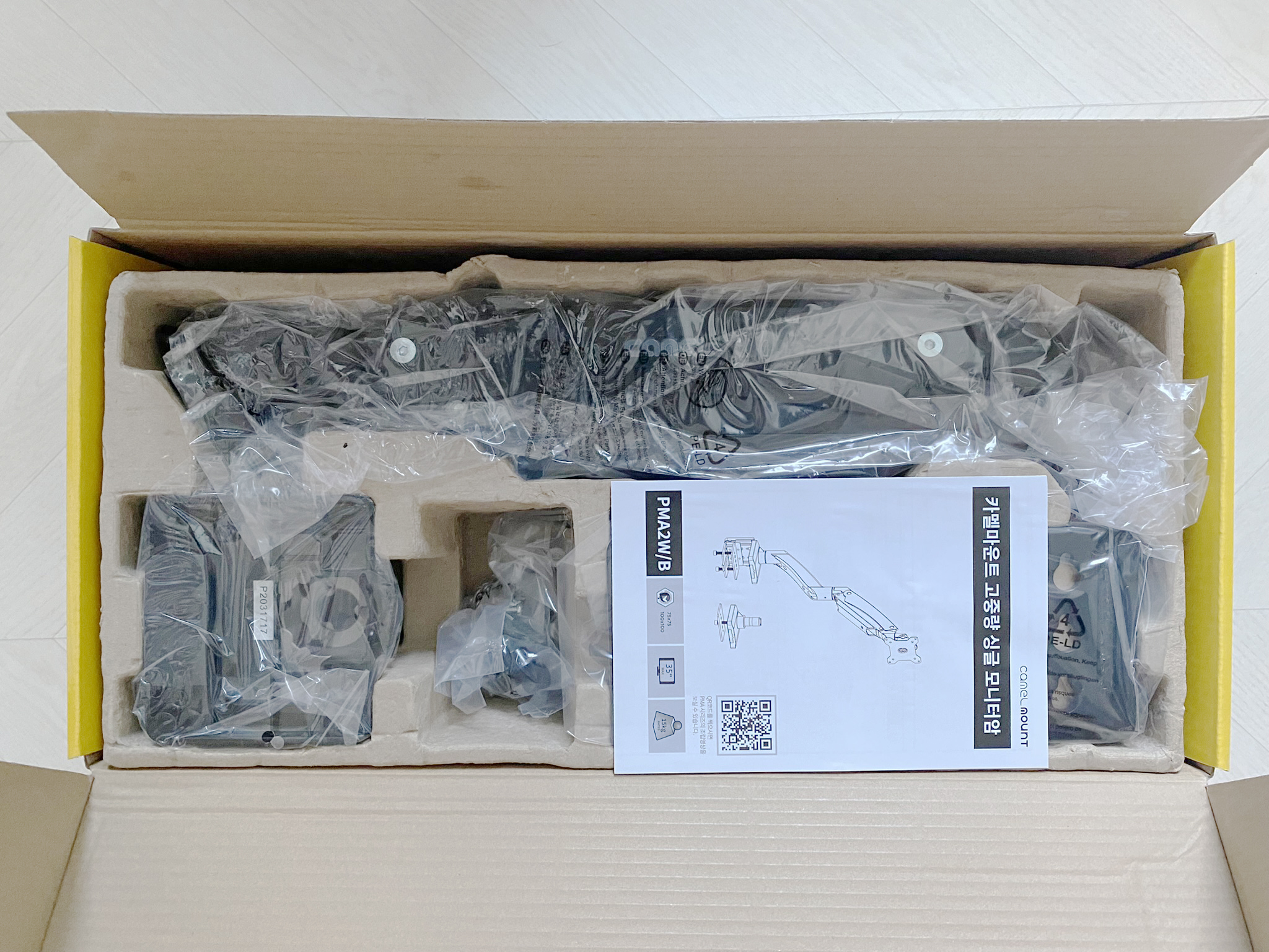 오랜만에 보는 모습입니다. 모니터암 부품들이 대부분 철로 되어 있고 도색이 되어 있죠. 그래서 비닐 포장과 계란 박스 같은 재질의 용기에 담겨 있습니다.