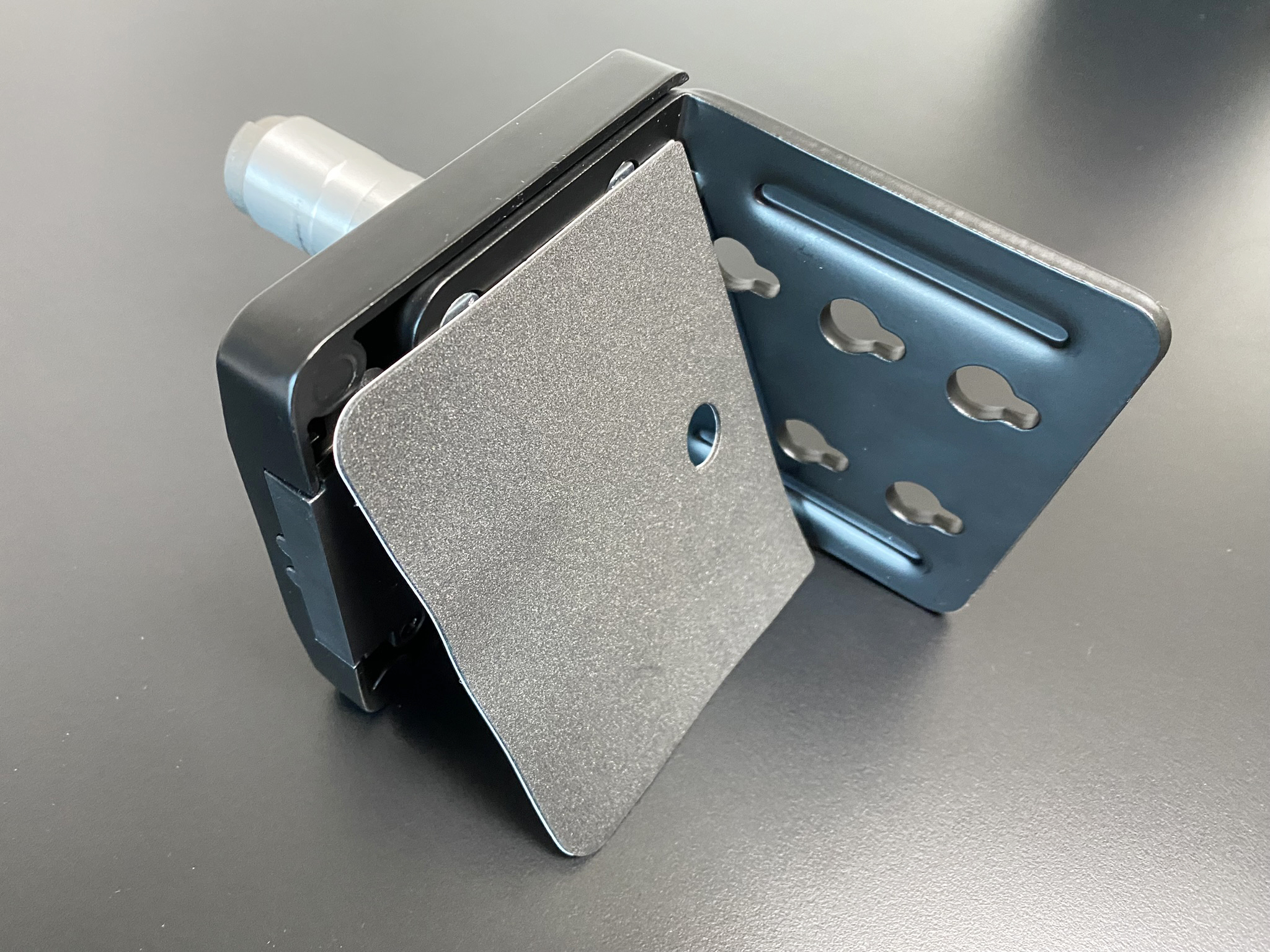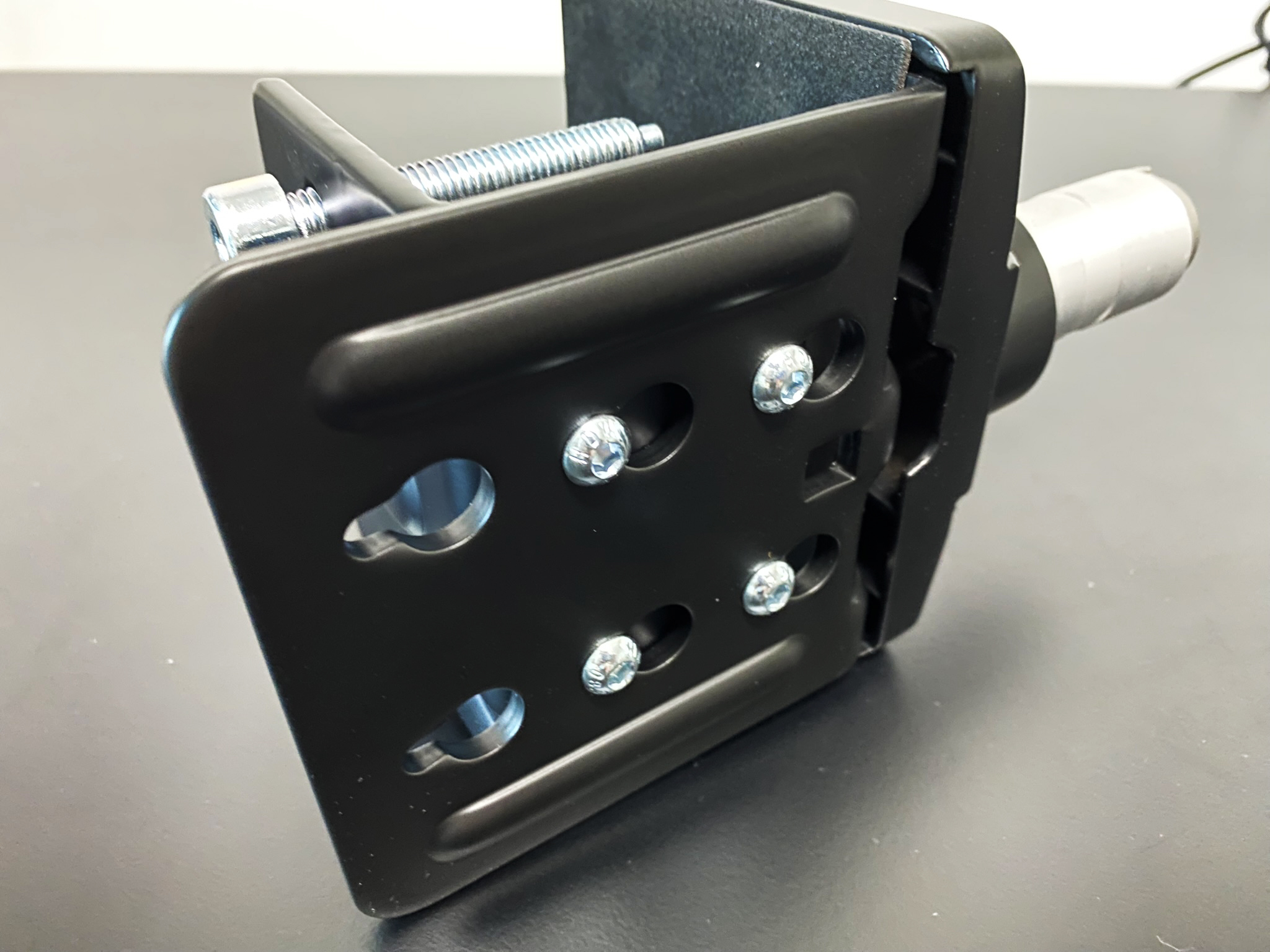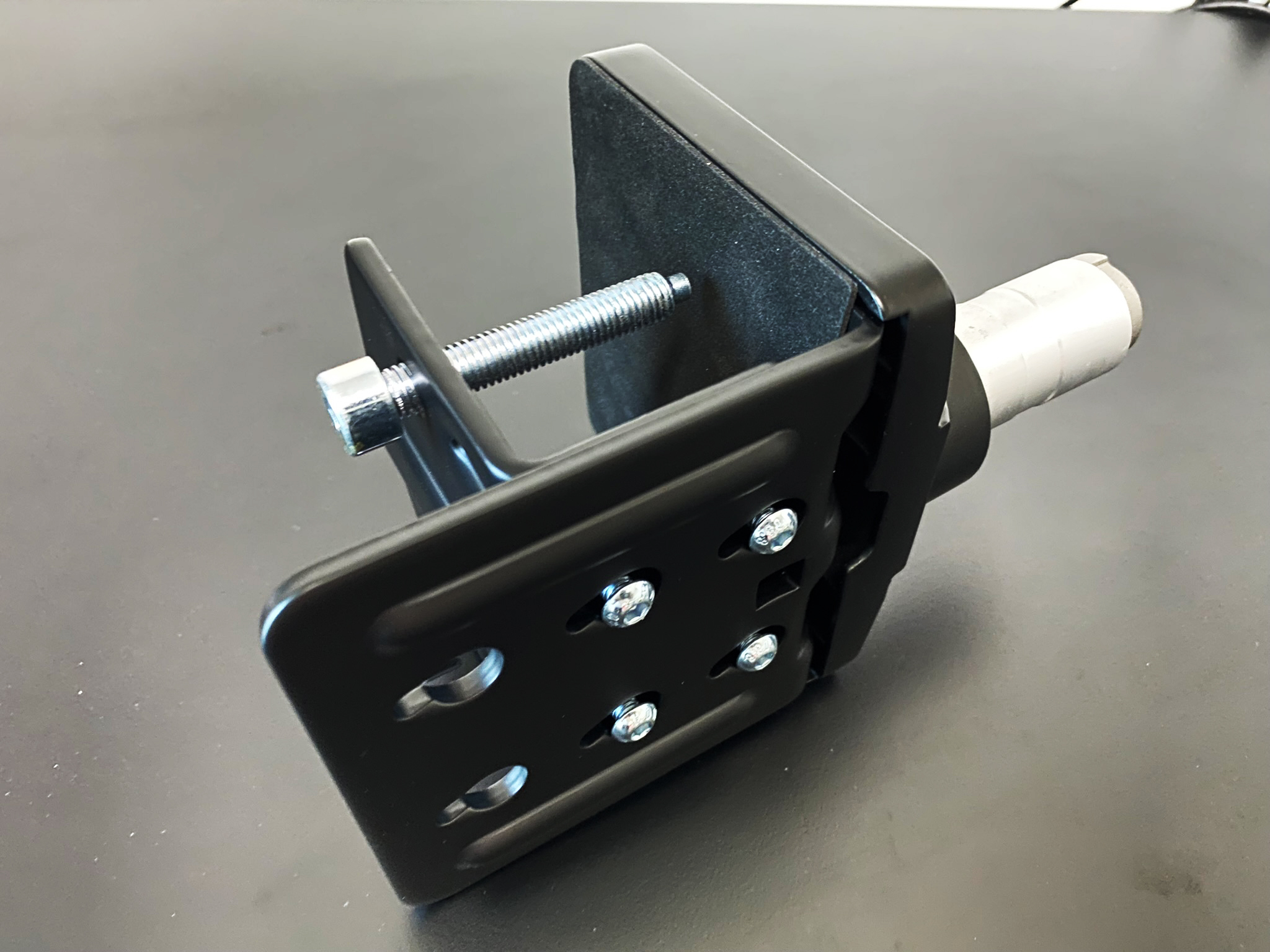 플레이트까지 걸쳐진 클램프를 책상에 맞춥니다. 그리고 나사를 조여주세요. 이때 꽉 조이시기 보다는 조금은 풀 수 있도록 하는 게 좋습니다. 이따가를 위해서고요. 저는 여기서 튀어나온 부분에 1단 모니터암을 먼저 결합을 했습니다.