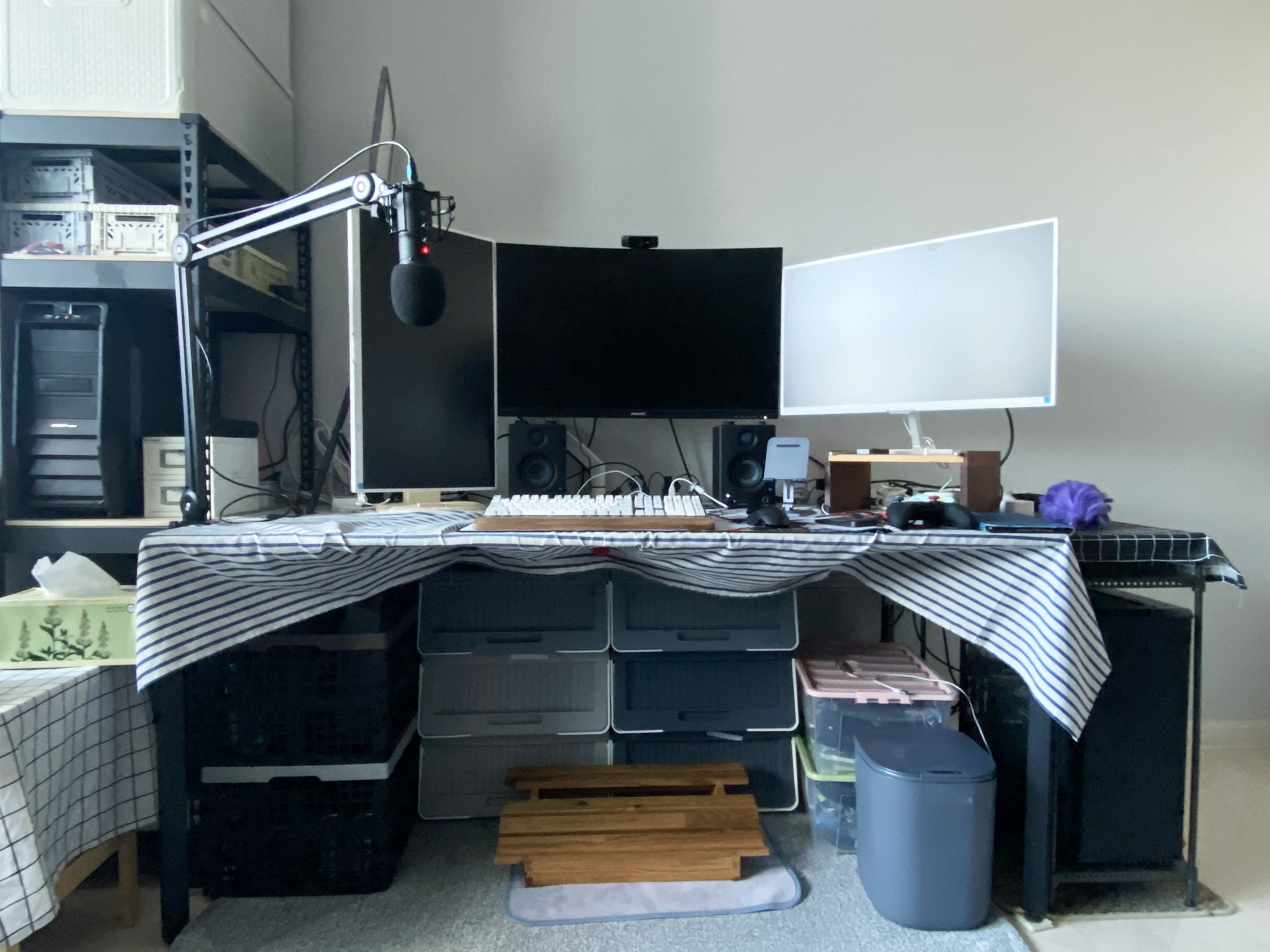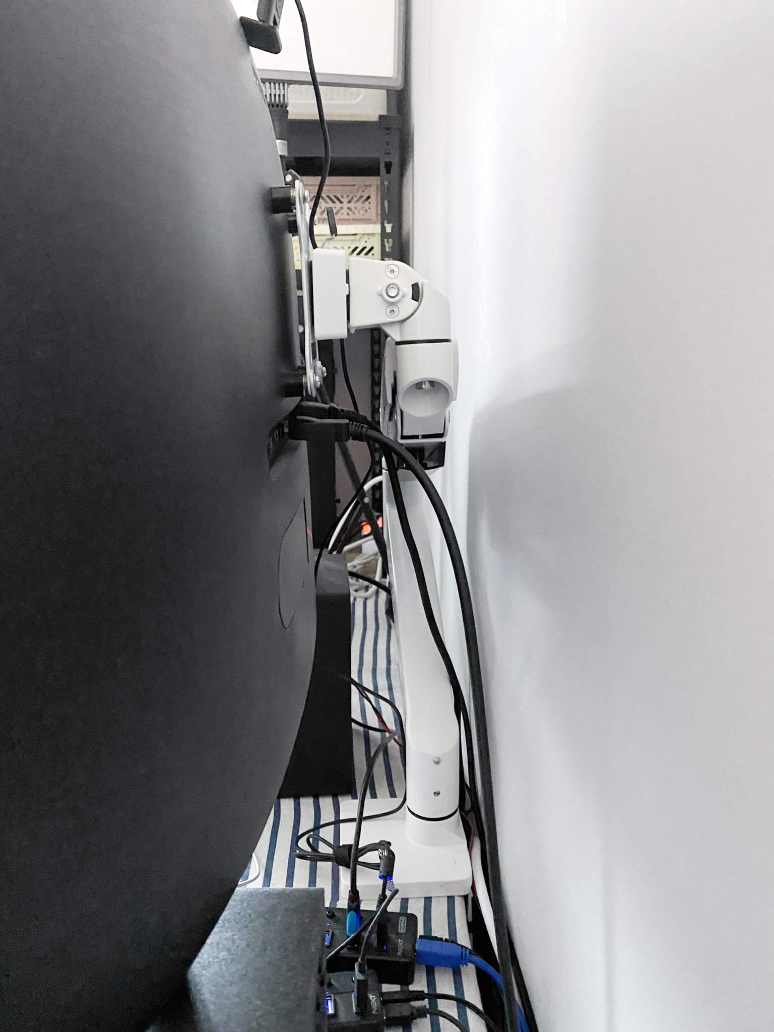 선정리를 다 하시면 모니터암 작업이 완료됩니다. 저는 흰색 모니터까지 선정리를 해보느라 땀을 뻘뻘 흘렸습니다. 워낙 장비가 많다보니 일부 선은 어쩔 수 없이 보이게 되더라고요. 이는 추후 장비 업그레이드를 하든지 혹은 신경쓰지 않고 살든지 하면 되는 부분 같습니다.