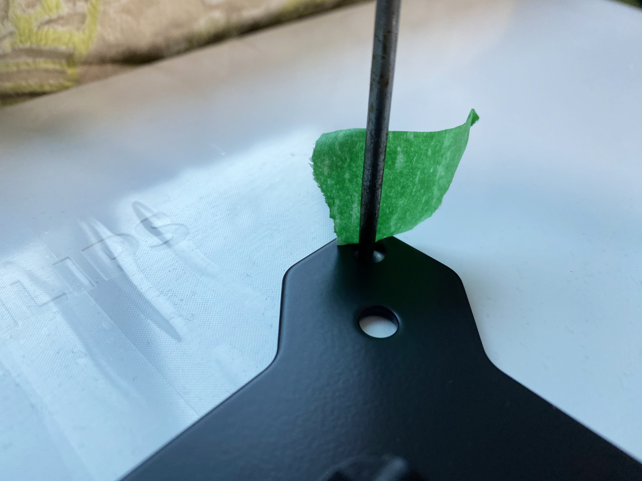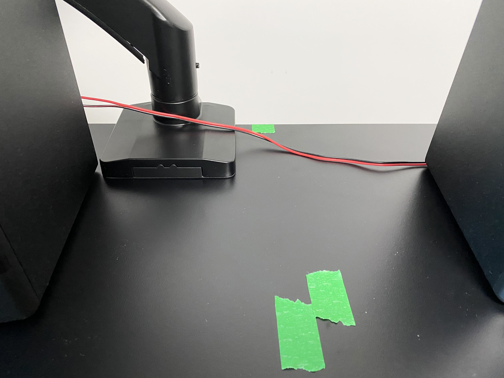 저는 마스킹 테이프를 이용해서 모니터 중앙의 현재 위치와 이상적인 위치를 표시했습니다. 그 차이만큼 클램프가 이동해야 한다는 거죠.
