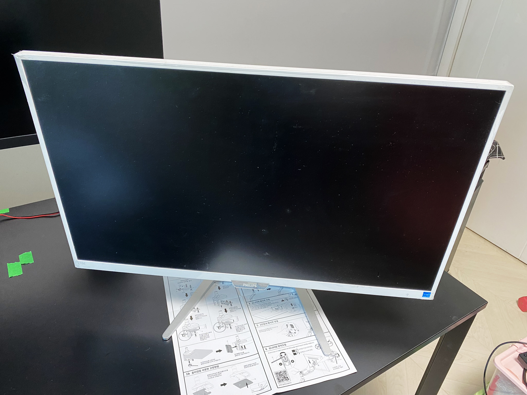 전체 구성품은 이렇습니다. 아, 모니터암 클램프에 붙이는 스티커는 못 찍었네요. 처음에 확인할 건 도색 상태입니다. 완벽하지는 않더라도 까진 부분이 있는지를 보셔야 합니다. 별로 신경 안 쓰이시는 분들은 넘어가셔도 좋습니다.