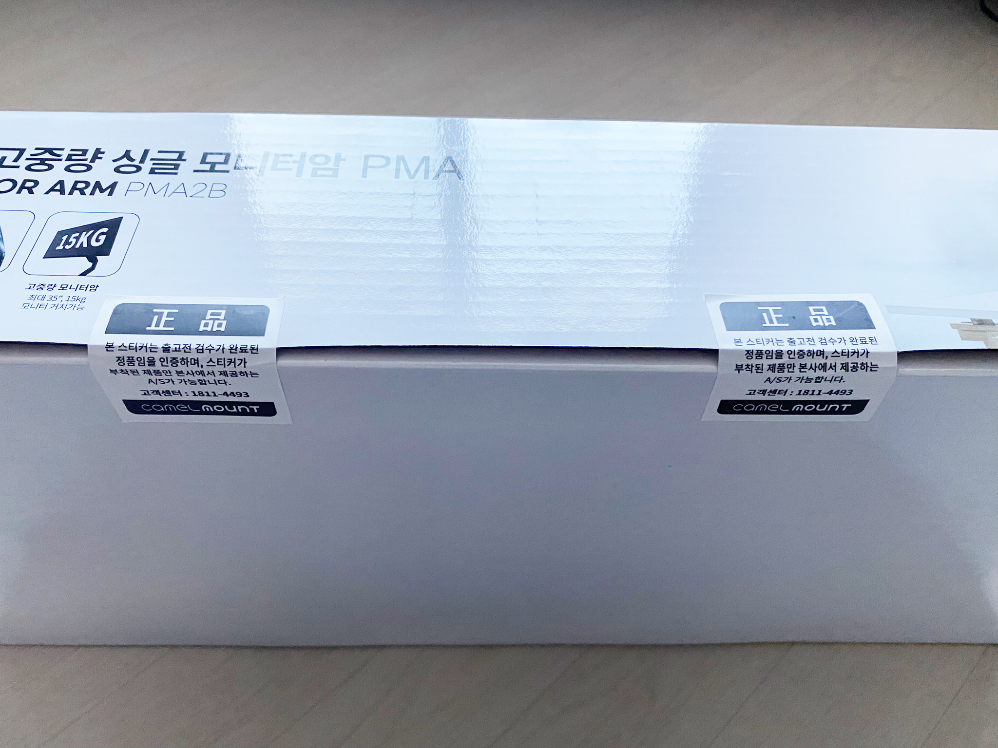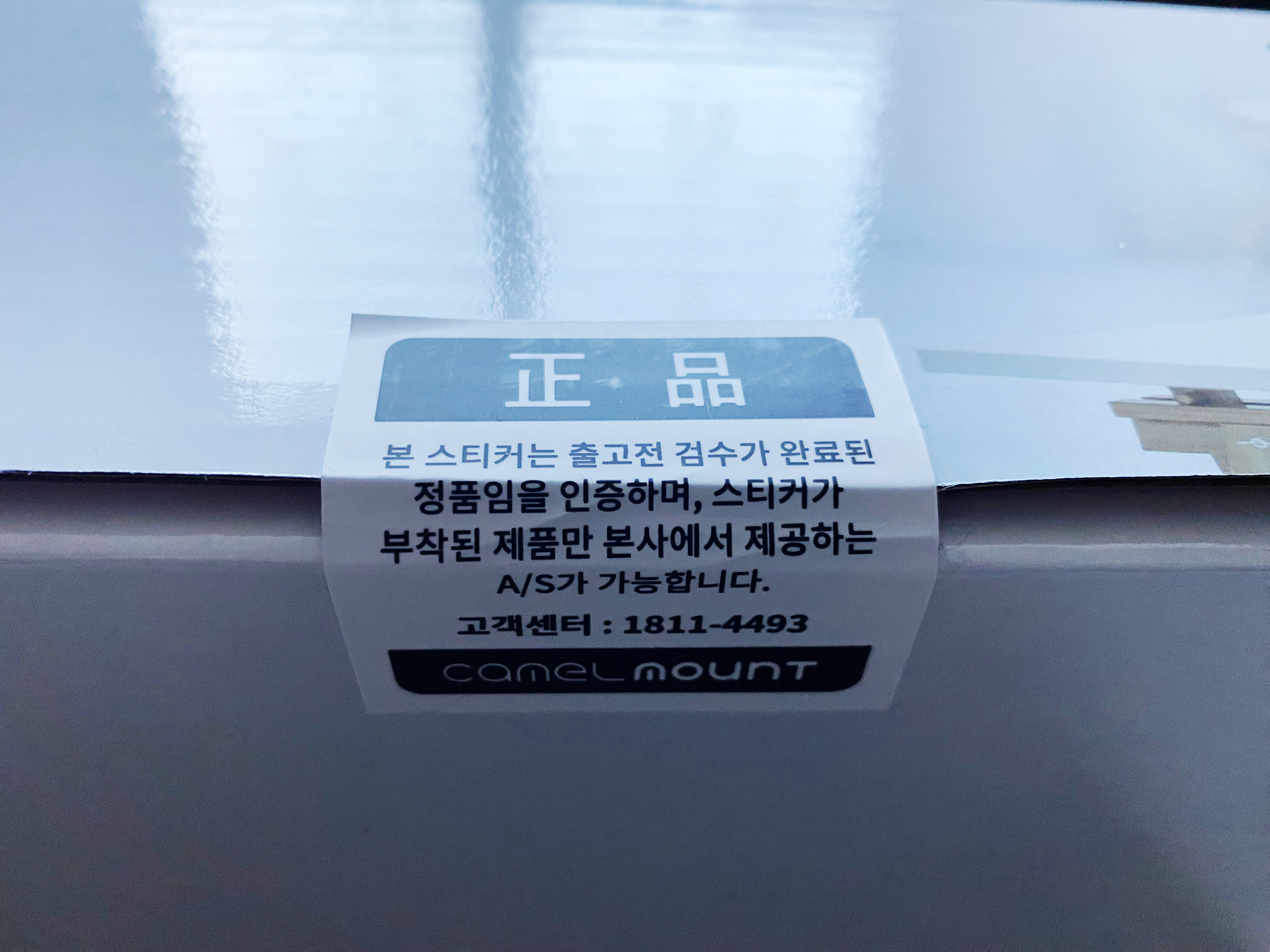 모니터암 박스 하단에는 정품 스티커가 붙여져 있습니다. 칼로 스티커를 자르시든 스티커를 살짝 떼서 개봉하시든 남겨두시는 게 좋습니다.