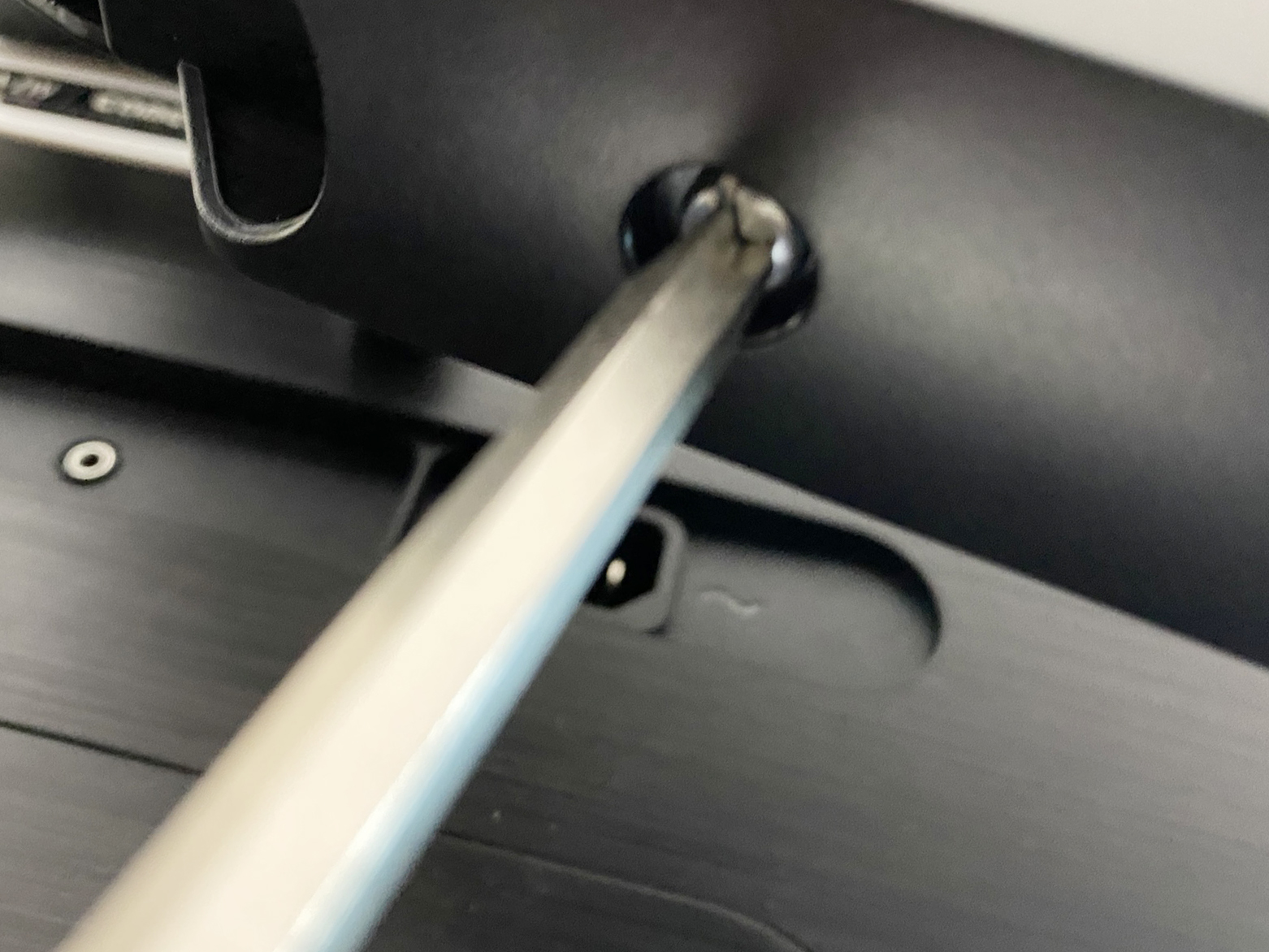 모니터와 스탠드를 분리했습니다. 스탠드가 있던 부분 껍질도 제대로 닫아주셔야 합니다. 참고로 이 모니터의 베사홀은 100*100입니다. 모니터 후방 중앙에 네 개의 구멍이 있고요. 구멍 사이의 길이를 줄자로 재보시면 나옵니다.