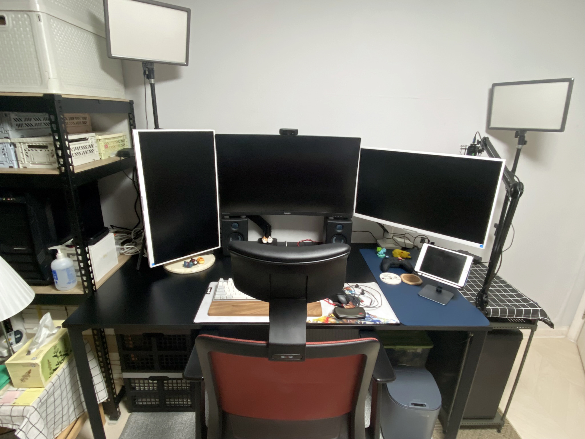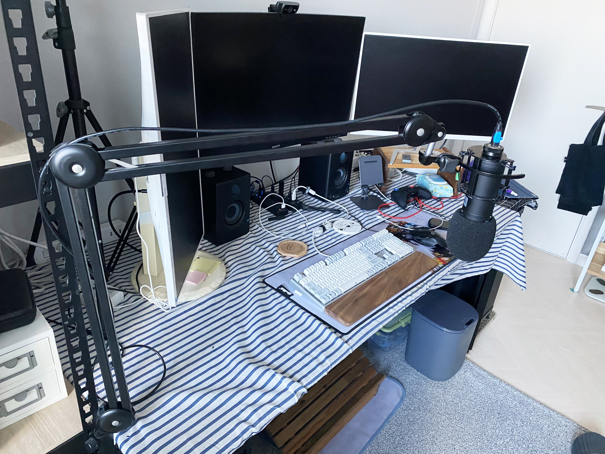 천을 빼내고, 모니터암을 새로 장착하고, 받침대를 사용해 멀티탭을 정리했습니다. 말씀드렸듯이 꿈의 데스크셋업은 아닙니다. 제 방에는 제 것이 아닌 물품들도 있고요. 기존에 있던 물건 때문에 컨셉을 맞추기도 어렵습니다. 흔한 LED/RGB 스트랩도 없죠.